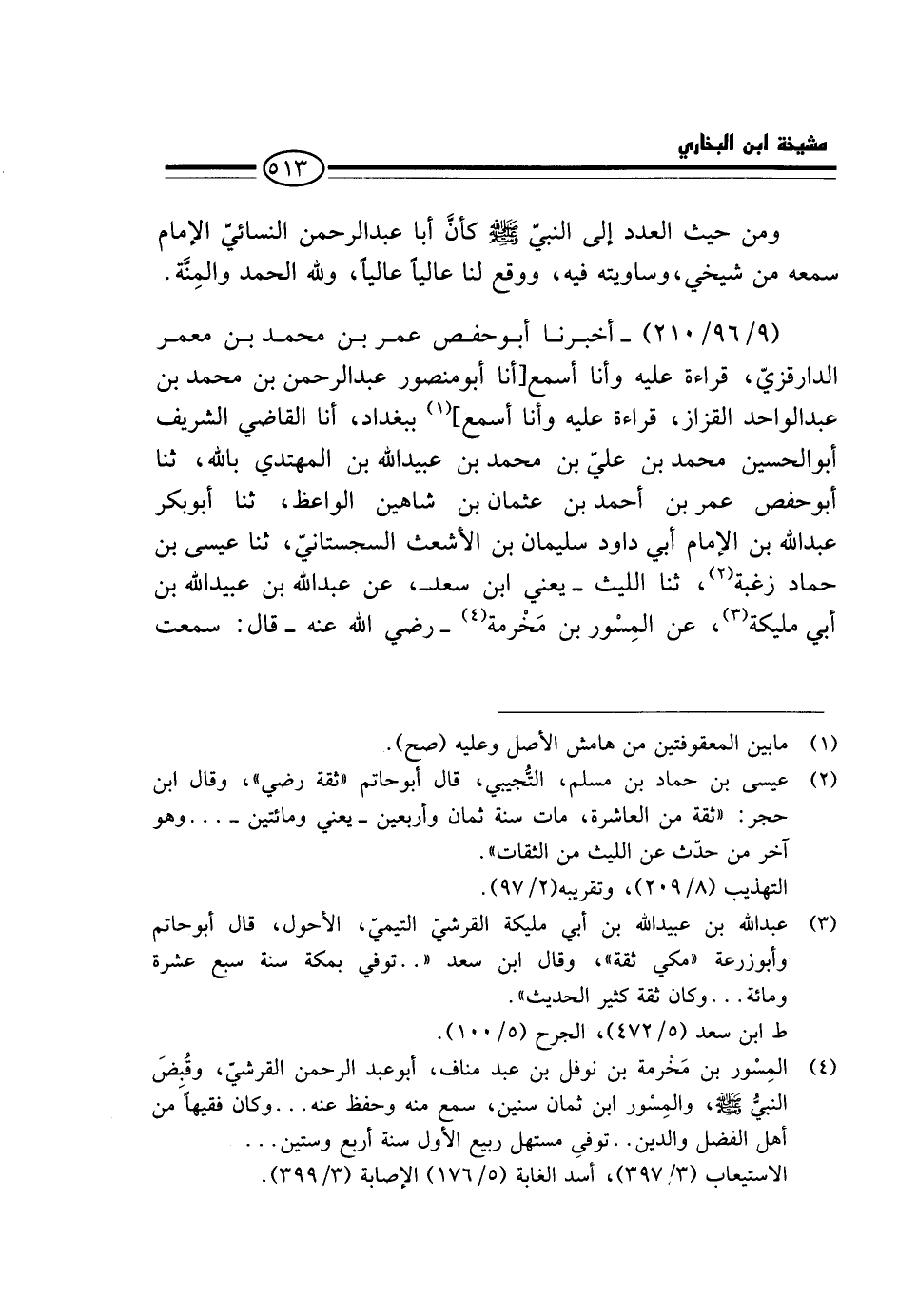 (9 / 96 / 210) - أَخْبَرَنَا أَبُو حَفْصٍ عُمَرُ بْنُ مُحَمَّدِ بْنِ مَعْمَرٍ الدَّارَقَزِّيُّ، قِرَاءَةً عَلَيْهِ وَأَنَا أَسْمَعُ [أَنَا أَبُو مَنْصُورٍ عَبْدُ الرَّحْمَنِ بْنِ مُحَمَّدِ بْنِ عَبْدِ الْوَاحِدِ الْقَزَّازُ، قِرَاءَةً عَلَيْهِ وَأَنَا أَسْمَعُ] بِبَغْدَادَ، أَنَا الْقَاضِي الشَّرِيفُ أَبُو الْحُسَيْنِ مُحَمَّدُ بْنُ عَلِيِّ بْنِ مُحَمَّدِ بْنِ عُبَيْدِ اللَّهِ بْنِ الْمُهْتَدِي بِاللَّهِ، ثَنَا أَبُو حَفْصٍ عُمَرُ بْنُ أَحْمَدَ بْنِ عُثْمَانَ بْنِ شَاهِينَ الْوَاعِظُ، ثَنَا أَبُو بَكْرٍ عبد الله بن الْإِمَامِ أَبِي دَاوُدَ سُلَيْمَانَ بْنِ الْأَشْعَثِ السِّجِسْتَانِيِّ، ثَنَا عِيسَى بْنُ حَمَّادٍ زُغْبَةُ، ثَنَا اللَّيْثُ - يَعْنِي ابْنَ سَعْدٍ -، عَنْ عَبْدِ اللَّهِ بْنِ عُبَيْدِ اللَّهِ بْنِ أَبِي مُلَيْكَةَ، عَنِ الْمِسْوَرِ بْنِ مَخْرَمَةَ - رَضِيَ اللَّهُ عَنْهُ - قَالَ: سَمِعْتُ