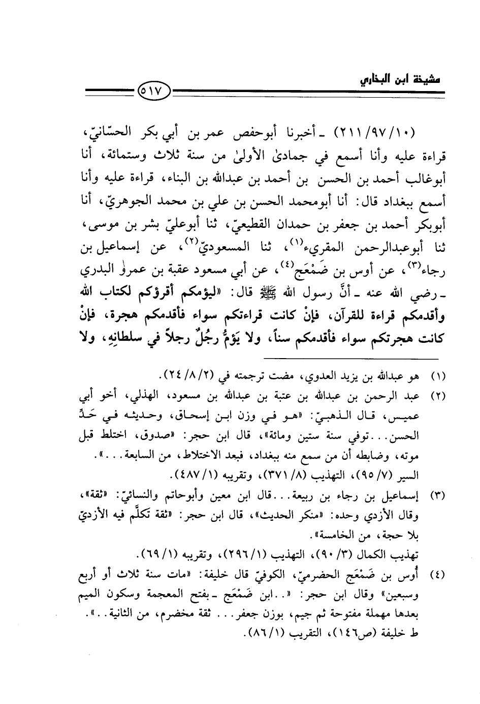(10 / 97 / 211) - أَخْبَرَنَا أَبُو حَفْصٍ عُمَرُ بْنُ أَبِي بَكْرٍ الْحَسَّانِيُّ، قِرَاءَةً عَلَيْهِ وَأَنَا أَسْمَعُ فِي جُمَادَى الأولى من سنة ثَلَاث وسِتمِائَة، أَنَا أَبُو غَالِبٍ أَحْمَدُ بْنُ الْحَسَنِ بْنِ أَحْمَدَ بْنِ عَبْدِ اللَّهِ بْنِ الْبَنَّاءِ، قِرَاءَةً عَلَيْهِ وَأَنَا أَسْمَعُ بِبَغْدَادَ قَالَ: أَنَا أَبُو مُحَمَّدٍ الْحَسَنُ بْنُ عَلِيِّ بْنِ مُحَمَّدٍ الْجَوْهَرِيُّ، أَنَا أَبُو بَكْرٍ أَحْمَدُ بْنُ جَعْفَرِ بْنِ حَمْدَانَ الْقَطِيعِيُّ، ثَنَا أَبُو عَلِيٍّ بِشْرُ بْنُ مُوسَى، ثَنَا أَبُو عَبْدِ الرَّحْمَنِ الْمُقْرِئُ، ثَنَا الْمَسْعُودِيُّ، عَنْ إِسْمَاعِيلَ بْنِ رَجَاءٍ، عَنْ أَوْسِ بْنِ ضَمْعَجٍ، عَنْ أَبِي مَسْعُودٍ عُقْبَةَ بْنِ عَمْرٍو الْبَدْرِيِّ - رَضِيَ اللَّهُ عَنْهُ - أَنَّ رَسُولَ الله - صَلَّى اللَّهُ عَلَيْهِ وَسَلَّم َ - قَالَ: " لِيَؤُمَّكُمْ أَقْرَؤُكُمْ لِكِتَابِ اللَّهِ وَأَقْدَمُكُمْ قِرَاءَةً لِلْقُرْآنِ، فَإِنْ كَانَتْ قِرَاءَتُكُمْ سَوَاءً فَأَقْدَمُكُمْ هِجْرَةً، فَإِن كَانَت هِجْرَتُكُمْ سَوَاءً فَأَقْدَمُكُمْ سِنًّا، وَلَا يَؤُمَّ رَجُلٌ رَجُلًا فِي سُلْطَانِهِ، وَلَا