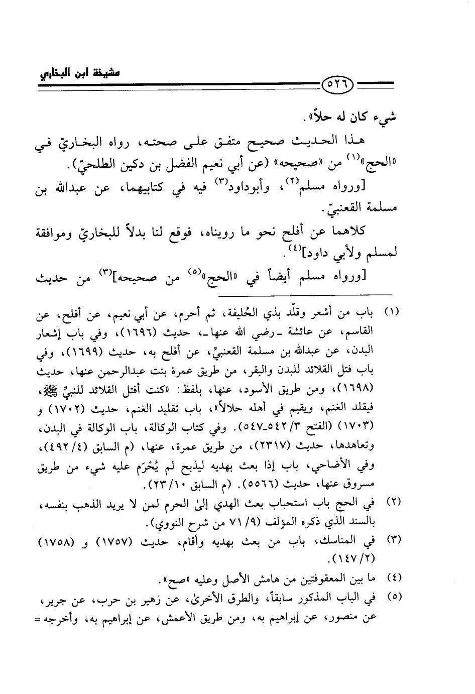 كِلَاهُمَا عَنْ أَفْلَح نَحْوَ مَا رَوَيْنَاهُ، فَوَقَعَ لَنَا بَدَلًا لِلْبُخَارِيِّ وَمُوَافَقَةً لِمُسْلِمٍ وَلِأَبِي دَاوُدَ] . [وَرَوَاهُ مُسْلِمٌ أَيْضًا فِي " الْحَجِّ " مِنْ صَحِيحِهِ] مِنْ حَدِيثِ