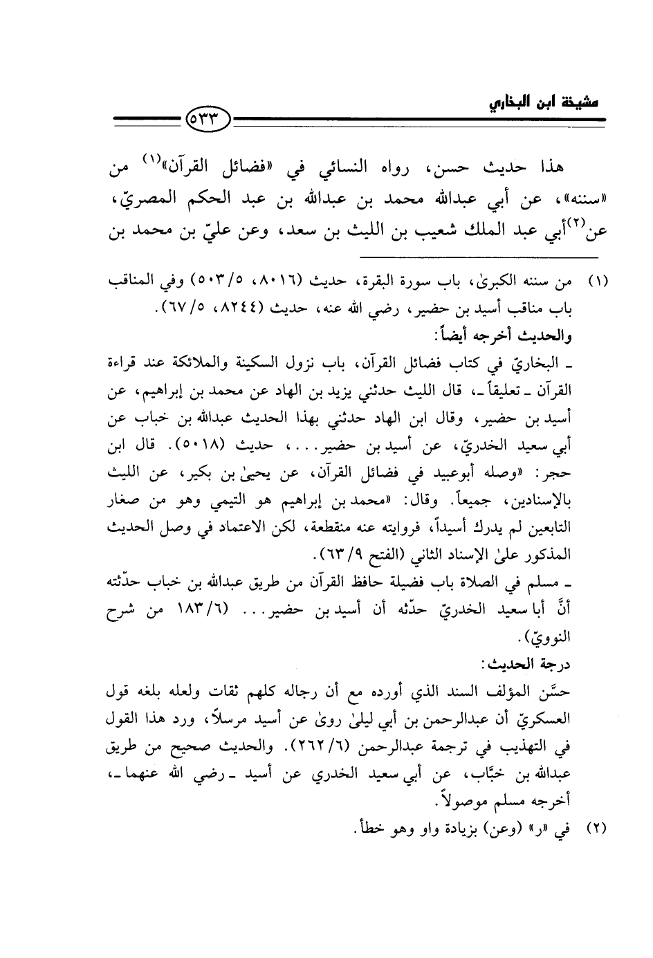 هَذَا حَدِيثٌ حَسَنٌ، رَوَاهُ النَّسَائِيُّ فِي " فَضَائِلِ الْقُرْآنِ " مِنْ " سُنَنِهِ " عَنْ أَبِي عَبْدِ اللَّهِ مُحَمَّدِ بْنِ عَبْدِ اللَّهِ بْنِ عَبْدِ الْحَكَمِ الْمِصْرِيِّ، عَنْ أَبِي عَبْدِ الْمَلِكِ شُعَيْبِ بْنِ اللَّيْثِ بْنِ سَعْدٍ، وَعَنْ عَلِيِّ بْنِ مُحَمَّدِ بن