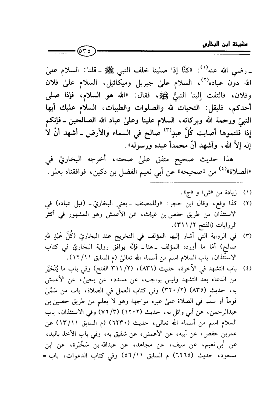 - رَضِيَ اللَّهُ عَنْهُ: " كُنَّا إِذَا صَلَّيْنَا خَلْفَ النَّبِي - صَلَّى اللَّهُ عَلَيْهِ وَسَلَّم َ - قُلْنَا: السَّلَامُ عَلَى اللَّهِ دُونَ عِبَادِهِ، السَّلَامُ عَلَى جِبْرِيلَ وَمِيكَائِيلَ، السَّلَامُ عَلَى فُلَانٍ وَفُلَانٍ، فَالْتَفت إِلَيْنَا النَّبِي - صَلَّى اللَّهُ عَلَيْهِ وَسَلَّم َ - فَقَالَ: " اللَّهُ هُوَ السَّلَامُ، فَإِذَا صَلَّى أَحَدُكُمْ، فَلْيَقُلْ: التَّحِيَّاتُ لِلَّهِ وَالصَّلَوَاتُ وَالطَّيِّبَاتُ، السَّلَامُ عَلَيْكَ أَيُّهَا النَّبِيُّ وَرَحْمَةُ اللَّهِ وَبَرَكَاتُهُ، السَّلَامُ عَلَيْنَا وَعَلَى عِبَادِ اللَّهِ الصَّالِحِينَ - فَإِنَّكُمْ إِذَا قُلْتُمُوهَا أَصَابَتْ كُلَّ عَبْدٍ صَالِح فِي السَّمَاءِ وَالْأَرْضِ - أَشْهَدُ أَنْ لَا إِلَهَ إِلَّا اللَّهُ، وَأَشْهَدُ أَنَّ مُحَمَّدًا عَبْدُهُ وَرَسُولُهُ ".