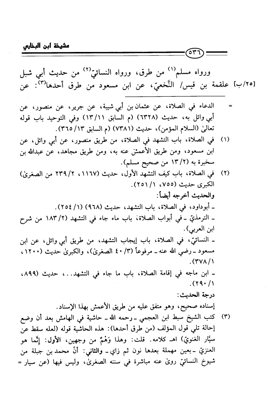 وَرَوَاهُ مُسْلِمٌ مِنْ طُرُقٍ، وَرَوَاهُ النَّسَائِيُّ مِنْ حَدِيثِ أَبِي شِبْلٍ عَلْقَمَةَ بْنِ قَيْسٍ / النَّخَعِيِّ، عَنِ ابْنِ مَسْعُودٍ مِنْ طُرُقٍ أَحَدُهَا: عَنْ