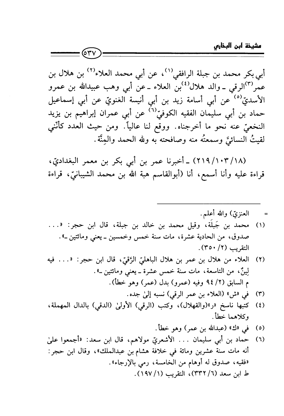 أَبِي بَكْرٍ مُحَمَّدِ بْنِ جَبَلَةَ الرَّافِقِيِّ، عَنْ أَبِي مُحَمَّدٍ الْعَلَاءِ بْنِ هِلَالِ بْنِ عُمَرَ الرَّقِّيِّ - وَالِدِ هِلَالِ بْنِ الْعَلاءِ - عَنْ أَبِي وَهْبٍ عُبَيْدِ اللَّهِ بْنِ عَمْرٍو الْأَسَدِيِّ عَنْ أَبِي أُسَامَةَ زَيْدِ بْنِ أَبِي أُنَيْسَةَ الْغَنَوِيِّ عَنْ أَبِي إِسْمَاعِيلَ حَمَّادِ بْنِ أَبِي سُلَيْمَانَ الْفَقِيهِ الْكُوفِيِّ عَنْ أَبِي عِمْرَانَ إِبْرَاهِيمَ بْنِ يَزِيدَ النَّخَعِيِّ عَنْهُ نَحْوَ مَا أَخْرَجْنَاهُ، وَوَقَعَ لَنَا عَالِيًا. وَمِنْ حَيْثُ الْعَدَدِ كَأَنَّنِي لَقِيتُ النَّسَائِيَّ وَسَمِعْتُهُ مِنْهُ وَصَافَحْتُهُ بِهِ وَلِلَّهِ الْحَمْدُ وَالْمِنَّةُ.