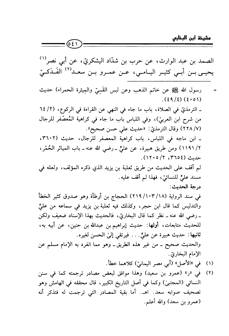 الصَّمَدِ بْنِ عَبْدِ الْوَارِثِ، عَنْ حَرْبِ بْنِ شَدَّادٍ الْيَشْكُرِيِّ، عَنْ أَبِي نَصْرٍ يَحْيَى بْنِ أَبِي كَثِيرٍ الْيَامِيِّ، عَنْ عَمْرِو بْنِ سَعْدٍ الفدكي