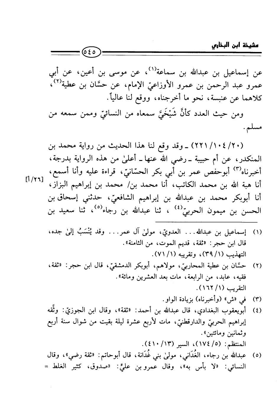 (20 / 104 / 221) - وَقَدْ وَقَعَ لَنَا هَذَا الْحَدِيثُ مِنْ رِوَايَةِ مُحَمَّدِ بْنِ الْمُنْكَدِرِ، عَنْ أُمِّ حَبِيبَةَ - رَضِيَ اللَّهُ عَنْهَا - أَعْلَى مِنْ هَذِهِ الرِّوَايَةِ بِدَرَجَةٍ، أَخْبَرَنَاهُ أَبُو حَفْصٍ عُمَرُ بْنُ أَبِي بَكْرٍ الْحَسَّانِيُّ، قِرَاءَةً عَلَيْهِ وَأَنَا أَسْمَعُ، أَنَا هِبَةُ اللَّهِ بْنُ مُحَمَّدٍ الْكَاتِبُ، أَنَا مُحَمَّدُ بْنُ / مُحَمَّدِ بْنِ إِبْرَاهِيمَ الْبَزَّازُ، أَنَا أَبُو بَكْرٍ مُحَمَّدُ بْنُ عَبْدِ اللَّهِ بْنِ إِبْرَاهِيمَ الشَّافِعِيُّ، حَدَّثَنِي إِسْحَاقُ بْنُ الْحَسَنِ بْنِ مَيْمُونٍ الْحَرْبِيُّ، ثَنَا عَبْدُ اللَّهِ بْنُ رَجَاءٍ، ثَنَا سَعِيدُ بْنُ