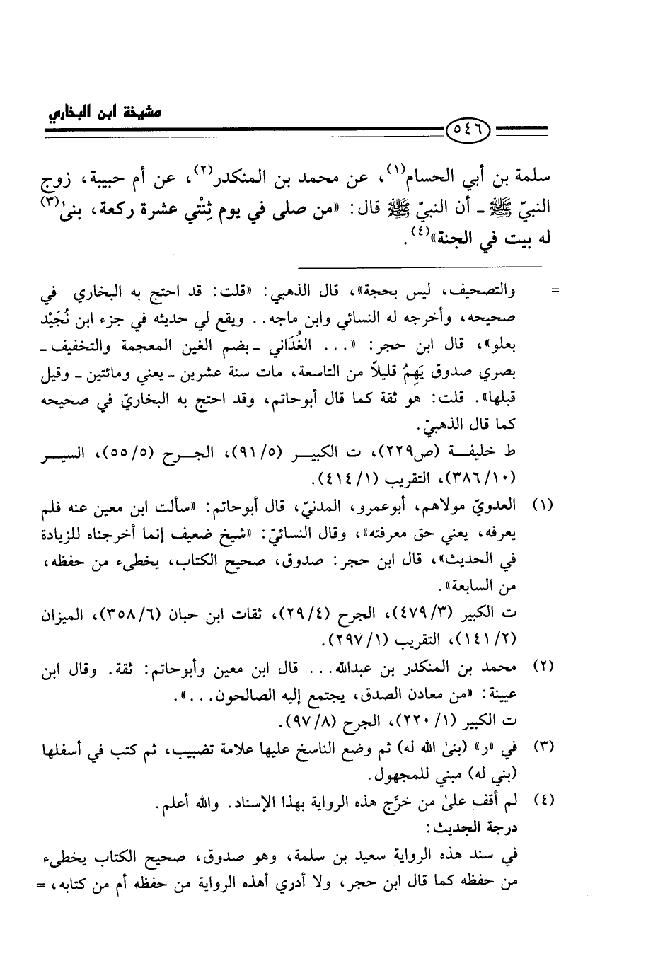 سَلَمَةَ بْنِ أَبِي الْحُسَامِ، عَنْ مُحَمَّدِ بْنِ الْمُنْكَدر، عَن أم حَبِيبَة، زوج النَّبِي - صَلَّى اللَّهُ عَلَيْهِ وَسَلَّم َ - أَن النَّبِي - صَلَّى اللَّهُ عَلَيْهِ وَسَلَّم َ - قَالَ: " مَنْ صَلَّى فِي يَوْمٍ ثِنْتَيْ عَشْرَةَ رَكْعَةً، بُنِيَ لَهُ بَيْتٌ فِي الْجَنَّةِ ".
