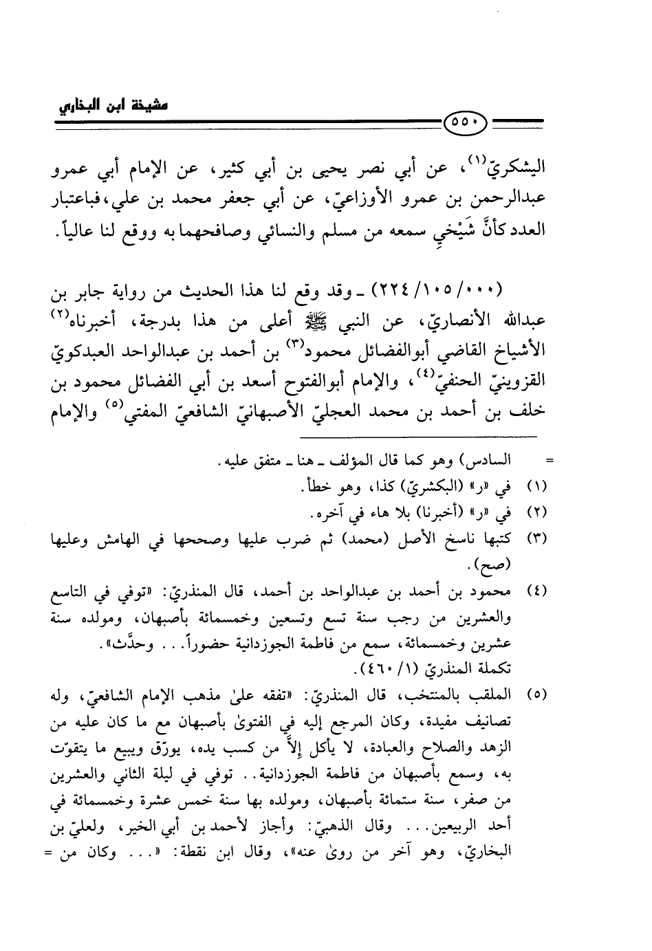 (000 / 105 / 224) - وَقَدْ وَقَعَ لَنَا هَذَا الْحَدِيثُ مِنْ رِوَايَةِ جَابِرِ بْنِ عَبْدِ اللَّهِ الْأَنْصَارِيِّ، عَنِ النَّبِي - صَلَّى اللَّهُ عَلَيْهِ وَسَلَّم َ - أَعْلَى مِنْ هَذَا بِدَرَجَةٍ، أَخْبَرَنَاهُ الْأَشْيَاخُ الْقَاضِي أَبُو الْفَضَائِلِ مَحْمُودُ بْنُ أَحْمَدَ بْنِ عَبْدِ الْوَاحِدِ الْعَبْدَكَوِيُّ الْقَزْوِينِيُّ الْحَنَفِيُّ، وَالْإِمَامُ أَبُو الْفُتُوح أَسْعَدُ بْنُ أَبِي الْفَضَائِلِ مَحْمُودِ بْنِ خَلَفِ بْنِ أَحْمَدَ بْنِ مُحَمَّدٍ الْعِجْلِيُّ الْأَصْبَهَانِيُّ الشَّافِعِيُّ الْمُفْتِي وَالْإِمَام