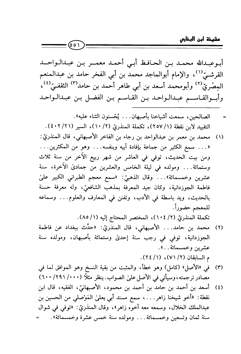 أَبُو عَبْدِ اللَّهِ مُحَمَّدُ بْنُ الْحَافِظِ أَبِي أَحْمَدَ مَعْمَرِ بْنِ عَبْدِ الْوَاحِدِ الْقُرَشِيُّ، وَالْإِمَامُ أَبُو الْمَاجِدِ مُحَمَّدُ بْنُ أَبِي الْفَخْرِ حَامِدِ بْنِ عَبْدِ الْمُنْعِمِ الْمِصْرِيُّ وَأَبُو مُحَمَّدٍ أَسْعَدُ بْنُ أَبِي طَاهِرٍ أَحْمَدَ بْنِ حَامِدٍ الثَّقَفِيُّ، وَأَبُو الْقَاسِمِ عَبْدُ الْوَاحِدِ بْنُ الْقَاسِمِ بْنِ الْفَضْلِ بْنِ عَبْدِ الْوَاحِدِ