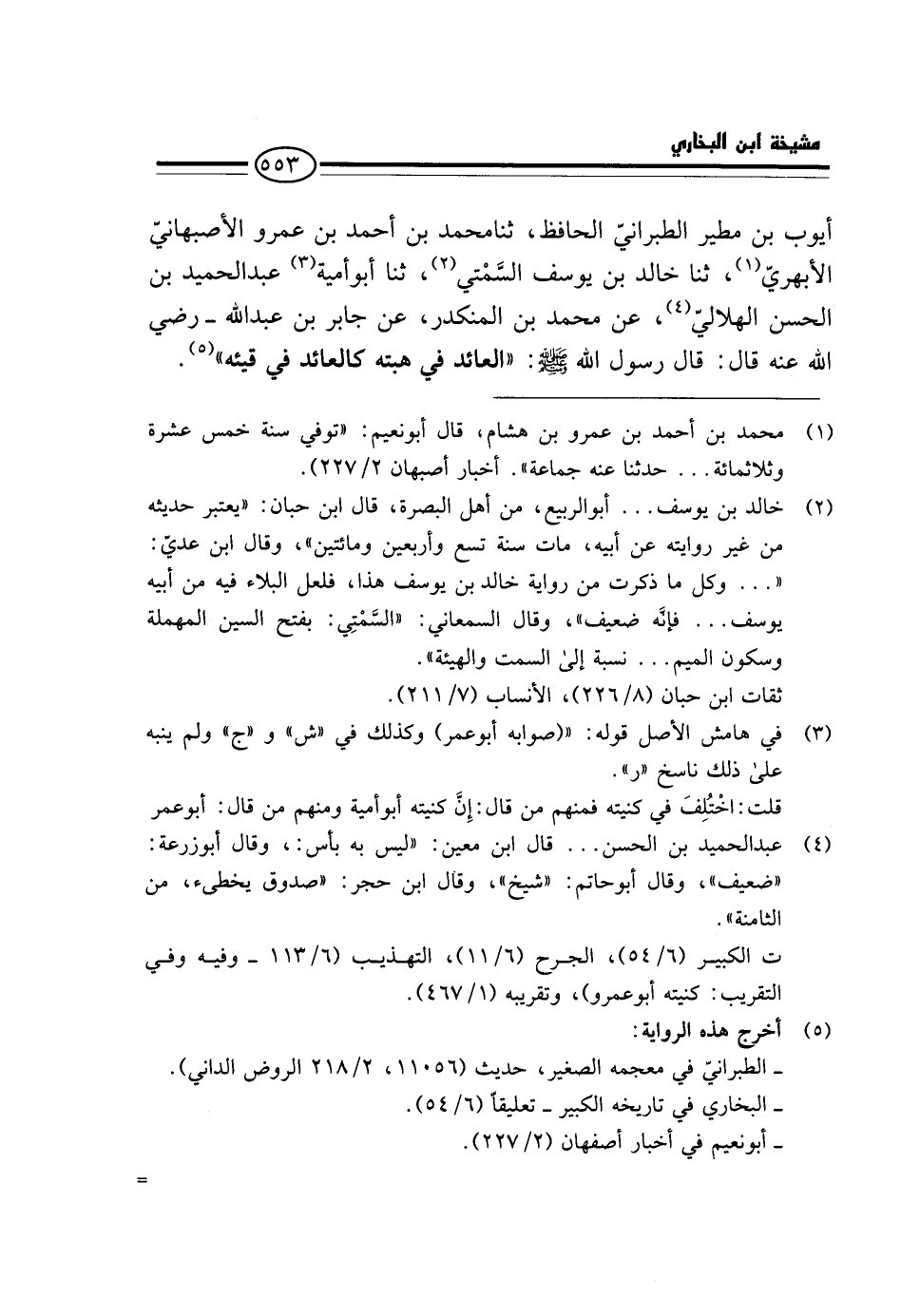 أَيُّوب بن مطير الطَّبَرَانِيّ الْحَافِظُ، ثَنَا مُحَمَّدُ بْنُ أَحْمَدَ بْنِ عَمْرٍو الْأَصْبَهَانِيُّ الْأَبْهَرِيُّ، ثَنَا خَالِدُ بْنُ يُوسُفَ السَّمْتِيُّ، ثَنَا أَبُو أُمَيَّةَ عَبْدُ الْحَمِيدِ بْنُ الْحَسَنِ الْهِلَالِيُّ، عَنْ مُحَمَّدِ بْنِ الْمُنْكَدِرِ، عَنْ جَابِرِ بْنِ عَبْدِ اللَّهِ - رَضِيَ اللَّهُ عَنْهُ قَالَ: قَالَ رَسُول الله - صَلَّى اللَّهُ عَلَيْهِ وَسَلَّم َ -: " الْعَائِدُ فِي هِبَتِهِ كَالْعَائِدِ فِي قَيْئِهِ ".