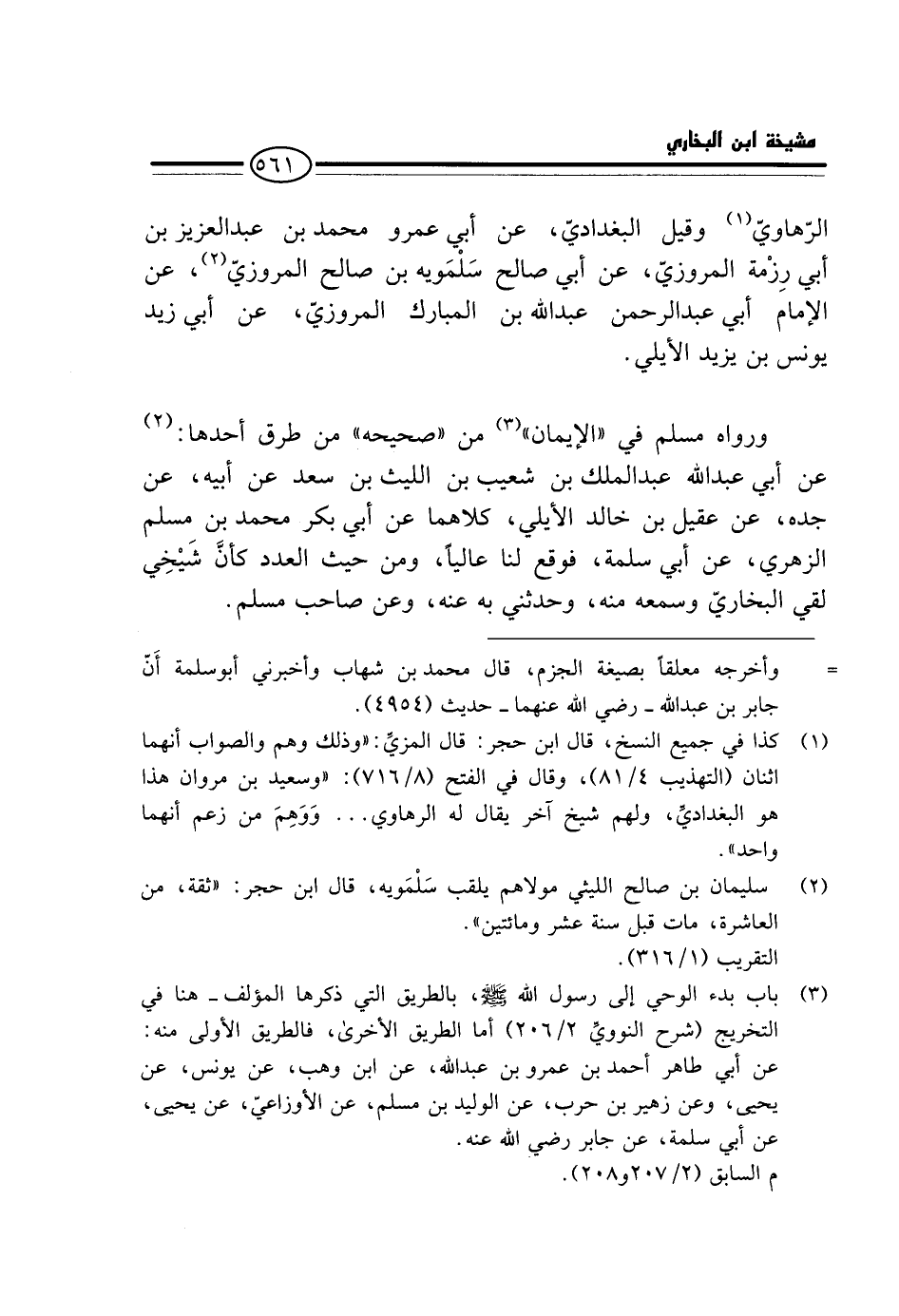 وَرَوَاهُ مُسْلِمٌ فِي " الْإِيمَانِ " مِنْ " صَحِيحِهِ " مِنْ طُرُقٍ أَحَدُهَا: عَنْ أَبِي عبد الله عبد الْملك بن شُعَيْب بن اللَّيْثِِ بْنِ سَعْدٍ عَنْ أَبِيهِ، عَنْ جَدِّهِ، عَنْ عُقَيْلِ بْنِ خَالِدٍ الْأَيْلِيِّ، كِلَاهُمَا عَنْ أَبِي بَكْرٍ مُحَمَّدِ بْنِ مُسْلِمٍ الزُّهْرِيِّ، عَنْ أَبِي سَلَمَةَ، فَوَقَعَ لَنَا عَالِيًا، وَمِنْ حَيْثُ الْعَدَدِ كَأَنَّ شَيْخِي لَقِيَ الْبُخَارِيَّ وَسَمِعَهُ مِنْهُ، وَحَدَّثَنِي بِهِ عَنْهُ، وَعَنْ صَاحِبِ مُسْلِمٍ.