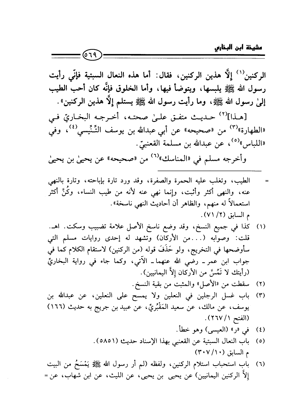 الرُّكْنَيْنِ إِلَّا هَذَيْنِ الرُّكْنَيْنِ، فَقَالَ: أَمَّا هَذِهِ النَّعْل السبتية فَإِنِّي رَأَيْت رَسُول الله - صَلَّى اللَّهُ عَلَيْهِ وَسَلَّم َ - يلبسهَا، وَيَتَوَضَّأُ فِيهَا، وَأَمَّا الْخَلُوقُ فَإِنَّهُ كَانَ أَحَبَّ الطّيب إِلَى رَسُول الله - صَلَّى اللَّهُ عَلَيْهِ وَسَلَّم َ -، وَمَا رَأَيْت رَسُول الله - صَلَّى اللَّهُ عَلَيْهِ وَسَلَّم َ - يَسْتَلِمُ إِلَّا هَذَيْنِ الرُّكْنَيْنِ ".