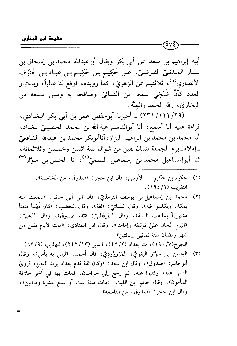أَبِيهِ إِبْرَاهِيمَ بْنِ سَعْدٍ عَنْ أَبِي بَكْرٍ وَيُقَالُ أَبُو عَبْدِ اللَّهِ مُحَمَّدُ بْنُ إِسْحَاقَ بْنِ يَسَارٍ الْمَدَنِيُّ الْقُرَشِيُّ، عَنْ حَكِيمِ بن حَكِيمِ بْنِ عَبَّادِ بْنِ حَنِيفٍ الْأَنْصَارِيِّ، ثَلَاثَتُهُمْ عَنِ الزُّهْرِيِّ، كَمَا رَوَيْنَاهُ، فَوَقَعَ لَنَا عَالِيًا، وَبِاعْتِبَارِ الْعَدَدِ كَأَنَّ شَيْخِي سَمِعَهُ مِنَ النَّسَائِيِّ وَصَافَحَهُ بِهِ وَمِمَّنْ سَمِعَهُ مِنَ الْبُخَارِيِّ، وَلِلَّهِ الْحَمْدُ وَالْمِنَّةُ.