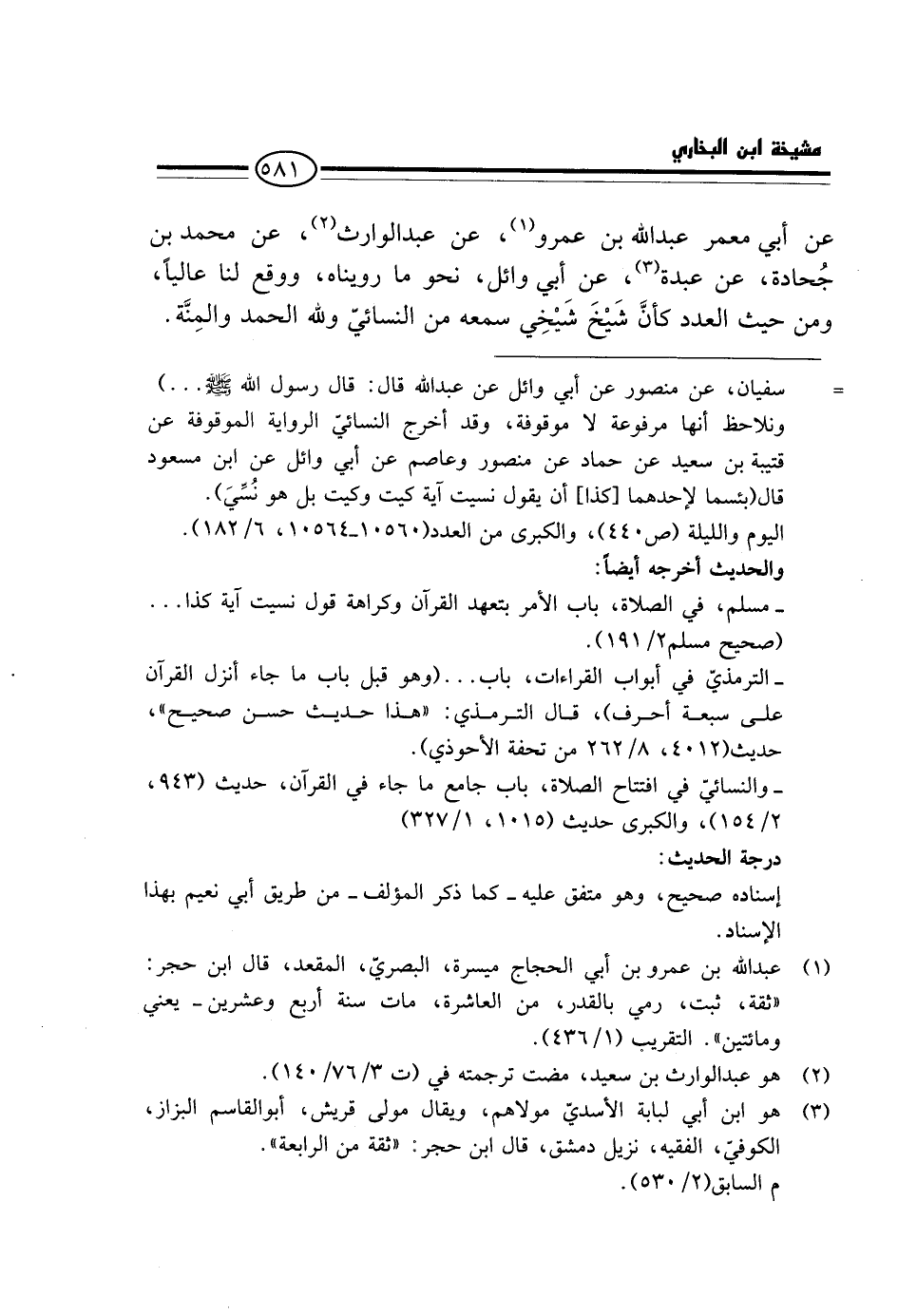 عَنْ أَبِي مَعْمَرٍ عَبْدِ اللَّهِ بْنِ عَمْرٍو، عَنْ عَبْدِ الْوَارِثِ، عَنْ مُحَمَّدِ بْنِ جُحَادَةَ، عَنْ عَبْدَةَ، عَنْ أَبِي وَائِلٍ، نَحْوَ مَا رَوَيْنَاهُ، وَوَقَعَ لَنَا عَالِيًا، وَمِنْ حَيْثُ الْعَدَدِ كَأَنَّ شَيْخَ شَيْخِي سَمِعَهُ مِنْ النَّسَائِيِّ وَلِلَّهِ الْحَمد والْمنَّة.
