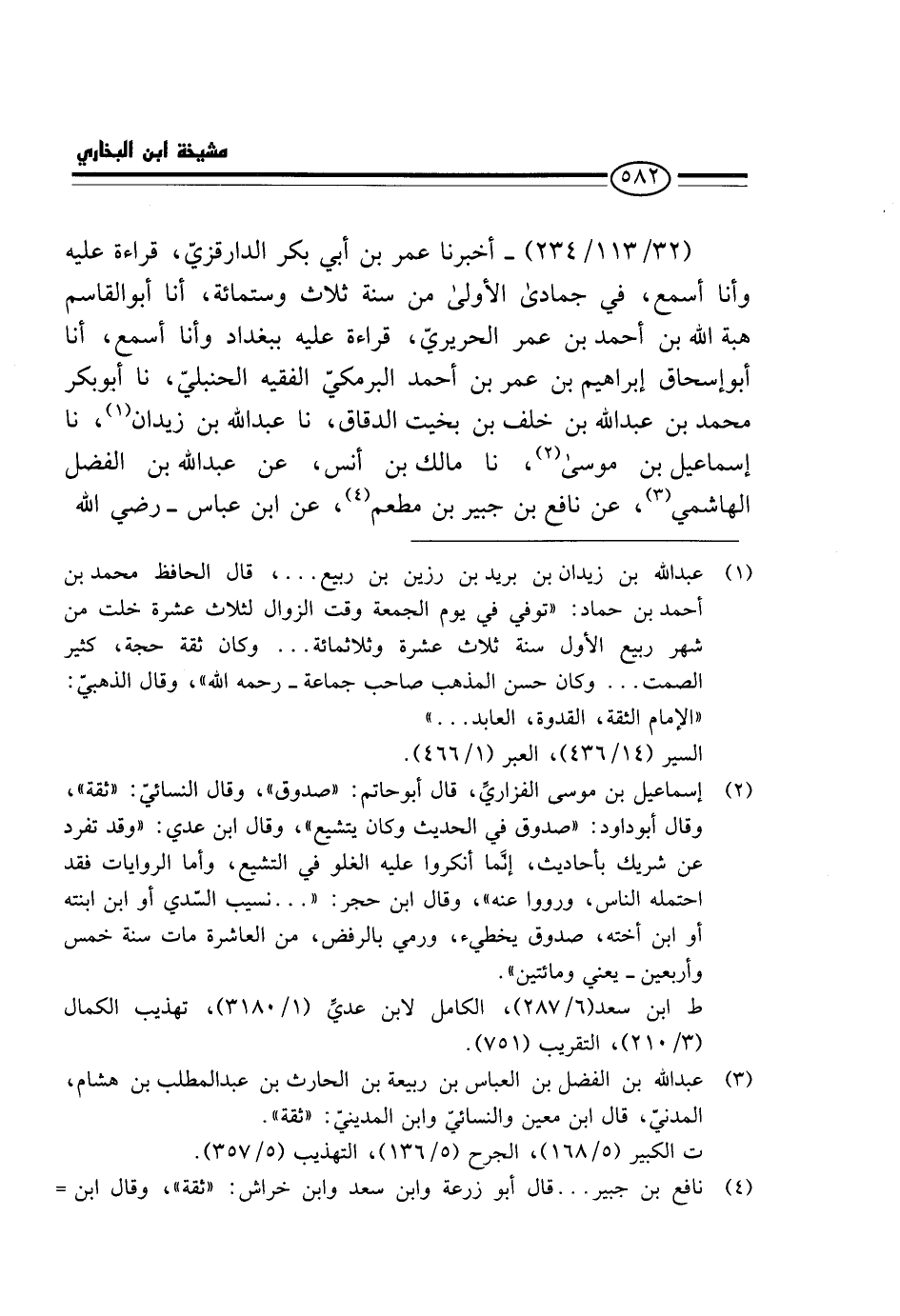 (32 / 113 / 234) - أَخْبَرَنَا عُمَرُ بْنُ أَبِي بَكْرٍ الدَّارَقَزِّيُّ، قِرَاءَةً عَلَيْهِ وَأَنَا أَسْمَعُ، فِي جُمَادَى الْأُولَى مِنْ سنة ثَلَاث وسِتمِائَة، أَنَا أَبُو الْقَاسِمِ هِبَةُ اللَّهِ بْنُ أَحْمَدَ بْنِ عُمَرَ الْحَرِيرِيُّ، قِرَاءَةً عَلَيْهِ بِبَغْدَادَ وَأَنَا أَسْمَعُ، أَنَا أَبُو إِسْحَاقَ إِبْرَاهِيمُ بْنُ عُمَرَ بْنِ أَحْمَدَ الْبَرْمَكِيُّ الْفَقِيهُ الْحَنْبَلِيُّ، نَا أَبُو بَكْرٍ مُحَمَّدُ بْنُ عَبْدِ اللَّهِ بْنِ خَلَفِ بْنِ بُخَيْتٍ الدَّقَّاقُ، نَا عَبْدُ اللَّهِ بْنُ زَيْدَانَ، نَا إِسْمَاعِيلُ بْنُ مُوسَى، نَا مَالِكُ بْنُ أَنَسٍ، عَنْ عَبْدِ اللَّهِ بْنِ الْفَضْلِ الْهَاشِمِيِّ، عَنْ نَافِعِ بْنِ جُبَيْرِ بْنِ مُطْعِمٍ، عَنِ ابْنِ عَبَّاسٍ - رَضِيَ اللَّهُ