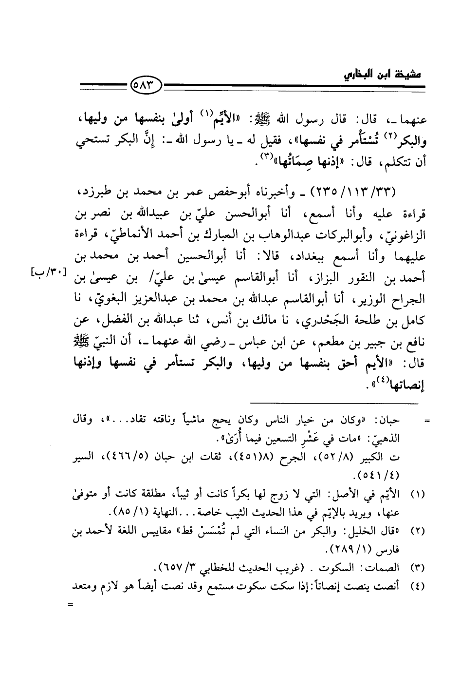 (33 / 113 / 235) - وَأَخْبَرَنَاهُ أَبُو حَفْصٍ عُمَرُ بْنُ مُحَمَّدِ بْنِ طَبَرْزَدَ، قِرَاءَةً عَلَيْهِ وَأَنَا أَسْمَعُ، أَنَا أَبُو الْحَسَنِ عَلِيُّ بْنُ عُبَيْدِ اللَّهِ بْنِ نَصْرِ بْنِ الزَّاغُونِيِّ، وَأَبُو الْبَرَكَاتِ عَبْدُ الْوَهَّابِ بْنُ الْمُبَارَكِ بْنِ أَحْمَدَ الْأَنْمَاطِيُّ، قِرَاءَةً عَلَيْهِمَا وَأَنَا أَسْمَعُ بِبَغْدَادَ، قَالَا: أَنَا أَبُو الْحُسَيْنِ أَحْمَدُ بْنُ مُحَمَّدِ بْنِ أَحْمَدَ بْنِ النَّقُّورِ الْبَزَّازُ، أَنَا أَبُو الْقَاسِمِ عِيسَى بْنُ عَلِىِّ / بْنِ عِيسَى بْنِ الْجَرَّاح الْوَزِيرُ، أَنَا أَبُو الْقَاسِمِ عَبْدُ اللَّهِ بْنُ مُحَمَّدِ بْنِ عَبْدِ الْعَزِيزِ الْبَغَوِيُّ، نَا كَامِلُ بْنُ طَلْحَةَ الْجَحْدَرِيُّ، نَا مَالِكُ بْنُ أَنَسٍ، ثَنَا عَبْدُ اللَّهِ بْنُ الْفَضْلِ، عَنْ نَافِعِ بْنِ جُبَيْرِ بْنِ مُطْعِمٍ، عَنِ ابْنِ عَبَّاسٍ - رَضِيَ اللَّهُ عَنْهُمَا -، أَن النَّبِي - صَلَّى اللَّهُ عَلَيْهِ وَسَلَّم َ - قَالَ: " الْأَيِّمُ أَحَقُّ بِنَفْسِهَا مِنْ وَلِيِّهَا، وَالْبِكْرُ تُسْتَأْمَرُ فِي نَفْسِهَا وَإِذْنُهَا إِنْصَاتُهَا ".