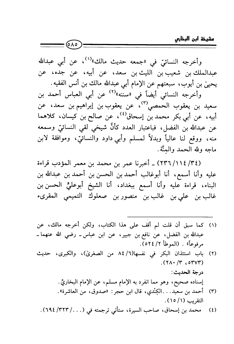 وَأَخْرَجَهُ النَّسَائِيُّ أَيْضًا فِي " سُنَنِهِ " عَنْ أَبِي الْعَبَّاسِ أَحْمَدَ بْنِ سَعِيدِ بْنِ يَعْقُوبَ الْحِمْصِيِّ عَنْ يَعْقُوبَ بْنِ إِبْرَاهِيمَ بْنِ سَعْدٍ، عَنْ أَبِيهِ، عَنْ أَبِي بَكْرٍ مُحَمَّدِ بْنِ إِسْحَاقَ، عَنْ صَالِح بْنِ كَيْسَانَ، كِلَاهُمَا عَنْ عَبْدِ اللَّهِ بْنِ الْفَضْلِ، فَبِاعْتِبَارِ الْعَدَدِ كَأَنَّ شَيْخِي لَقِيَ النَّسَائِيَّ وَسَمِعَهُ مِنْهُ، وَوَقَعَ لَنَا عَالِيًا وَبَدَلًا لِمُسْلِمٍ وَأَبِي دَاوُدَ وَالنَّسَائِيِّ، وَمُوَافَقَةً لِابْنِ مَاجَهْ وَلِلَّهِ الْحَمْدُ وَالْمِنَّةُ.