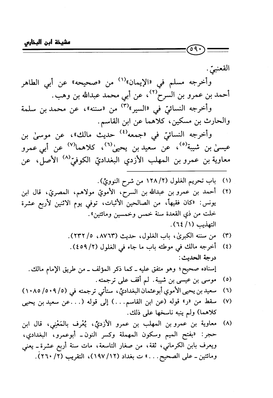 وأخرحه النَّسَائِيُّ فِي " السِّيَرِ " مِنْ " سُنَنِهِ "، عَنْ مُحَمَّدِ بْنِ سَلَمَةَ وَالْحَارِثِ بْنِ مِسْكِينٍ، كِلَاهُمَا عَنِ ابْنِ الْقَاسِمِ.