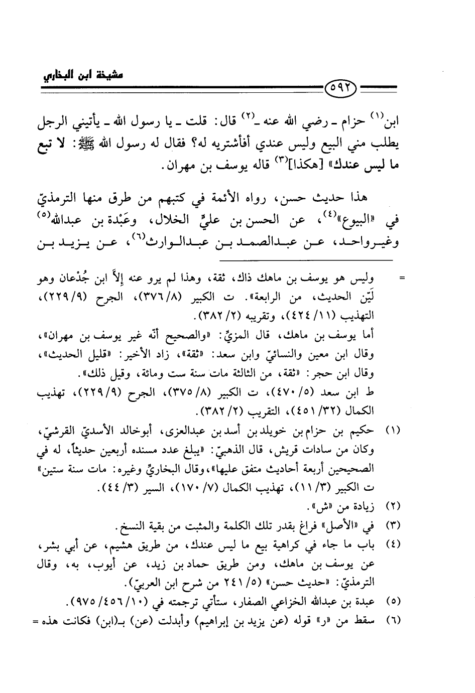 ابْن حِزَامٍ - رَضِيَ اللَّهُ عَنْهُ - قَالَ: قُلْتُ - يَا رَسُولَ اللَّهِ - يَأْتِينِي الرَّجُلُ يَطْلُبُ مِنِّي الْبَيْعَ وَلَيْسَ عِنْدِي أَفَأَشْتَرِيهِ لَهُ؟ فَقَالَ لَهُ رَسُولُ الله - صَلَّى اللَّهُ عَلَيْهِ وَسَلَّم َ -: " لَا تَبِعْ مَا لَيْسَ عِنْدَكَ " [هَكَذَا] قَالَهُ يُوسُفُ بْنُ مِهْرَانَ.