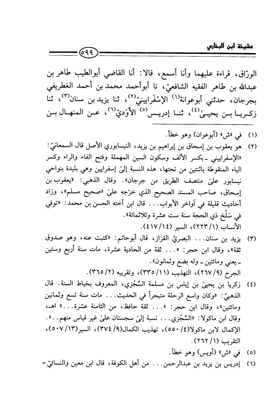الْوَرَّاقُ، قِرَاءَةً عَلَيْهِمَا وَأَنَا أَسْمَعُ، قَالَا: أَنَا الْقَاضِي أَبُو الطَّيِّبِ طَاهِرُ بْنُ عَبْدِ اللَّهِ بْنِ طَاهِرٍ الْفَقِيهُ الشَّافِعِيُّ، نَا أَبُو أَحْمَدَ مُحَمَّدُ بْنُ أَحْمَدَ الْغِطْرِيفِيُّ بِجُرْجَانَ، حَدَّثَنِي أَبُو عَوَانَةَ الْإِسْفَرَايِينِيُّ، ثَنَا يَزِيدُ بْنُ سِنَانٍ، ثَنَا زَكَرِيَّا بْنُ يَحْيَى، ثَنَا إِدْرِيسُ الْأَوْدِيُّ، عَنِ الْمنْهَال بن