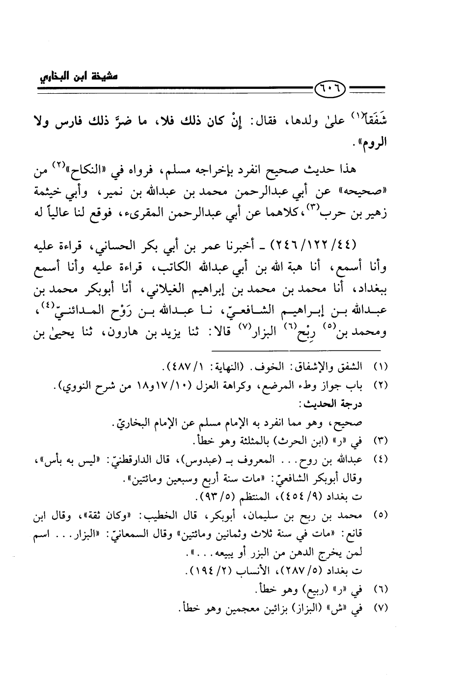 (44 / 122 / 246) - أَخْبَرَنَا عُمَرُ بْنُ أَبِي بَكْرٍ الْحَسَّانِيُّ، قِرَاءَةً عَلَيْهِ وَأَنَا أَسْمَعُ، أَنَا هِبَةُ اللَّهِ بْنُ أَبِي عَبْدِ اللَّهِ الْكَاتِبُ، قِرَاءَةً عَلَيْهِ وَأَنَا أَسْمَعُ بِبَغْدَادَ، أَنَا مُحَمَّدُ بْنُ مُحَمَّدِ بْنِ إِبْرَاهِيمَ الْغَيْلَانِيُّ، أَنَا أَبُو بَكْرٍ مُحَمَّدُ بْنُ عَبْدِ اللَّهِ بْنِ إِبْرَاهِيمَ الشَّافِعِيُّ، نَا عَبْدُ اللَّهِ بْنُ رَوْح الْمَدَائِنِيُّ، وَمُحَمَّدُ بْنُ رِبْح الْبَزَّارُ قَالَا: ثَنَا يَزِيدُ بْنُ هَارُونَ، ثَنَا يَحْيَى بْنُ