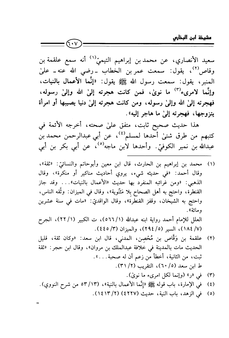 سَعِيدٍ الْأَنْصَارِيُّ، عَنْ مُحَمَّدِ بْنِ إِبْرَاهِيمَ التَّيْمِيِّ أَنَّهُ سَمِعَ عَلْقَمَةَ بْنَ وَقَّاصٍ، يَقُولُ: سَمِعْتُ عُمَرَ بْنَ الْخَطَّابِ - رَضِيَ اللَّهُ عَنْهُ - عَلَى الْمِنْبَر، يَقُول: سَمِعت رَسُول الله - صَلَّى اللَّهُ عَلَيْهِ وَسَلَّم َ - يَقُولُ: " إِنَّمَا الْأَعْمَالُ بِالنِّيَّاتِ، وَإِنَّمَا لِامْرِئٍ مَا نَوَى، فَمَنْ كَانَتْ هِجْرَتُهُ إِلَى اللَّهِ وَإِلَى رَسُولِهِ، فَهِجْرَتُهُ إِلَى اللَّهِ وَإِلَى رَسُولِهِ، وَمَنْ كَانَتْ هِجْرَتُهُ إِلَى دُنْيَا يُصِيبُهَا أَوِ امْرَأَةٍ يَتَزَوَّجُهَا، فَهِجْرَتُهُ إِلَى مَا هَاجَرَ إِلَيْهِ ".
