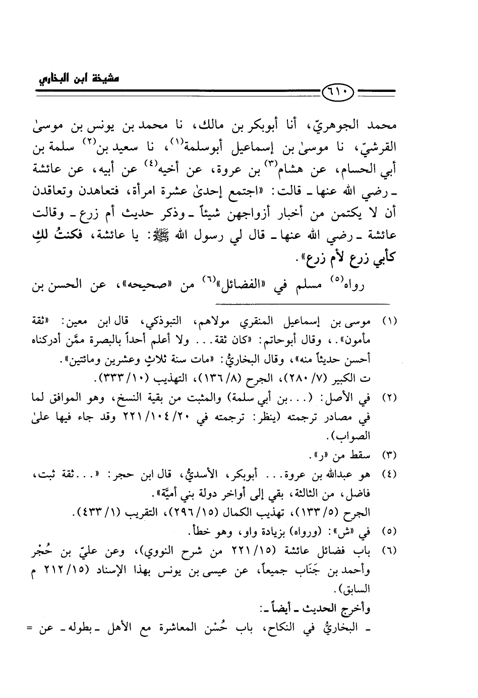 مُحَمَّدٍ الْجَوْهَرِيُّ، أَنَا أَبُو بَكْرِ بْنُ مَالِكٍ، نَا مُحَمَّدُ بْنُ يُونُسَ بْنِ مُوسَى الْقُرَشِيُّ، نَا مُوسَى بْنُ إِسْمَاعِيلَ أَبُو سَلَمَةَ، نَا سَعِيدُ بْنُ سَلَمَةَ بْنِ أَبِي الْحُسَامِ، عَنْ هِشَامِ بْنِ عُرْوَةَ، عَنْ أَخِيهِ عَنْ أَبِيهِ، عَنْ عَائِشَةَ - رَضِيَ اللَّهُ عَنْهَا - قَالَتْ: " اجْتَمَعَ إِحْدَى عَشْرَةَ امْرَأَةً، فَتَعَاهَدْنَ وَتَعَاقَدْنَ أَنْ لَا يَكْتُمْنَ مِنْ أَخْبَارِ أَزْوَاجِهِنَّ شَيْئًا - وَذَكَرَ حَدِيثَ أُمِّ زَرْعٍ - وَقَالَتْ عَائِشَةُ - رَضِيَ اللَّهُ عَنْهَا - قَالَ لي رَسُول الله - صَلَّى اللَّهُ عَلَيْهِ وَسَلَّم َ -: يَا عَائِشَةُ، فَكُنْتُ لَكِ كَأَبِي زَرْعٍ لِأُمِّ زَرْعٍ ".