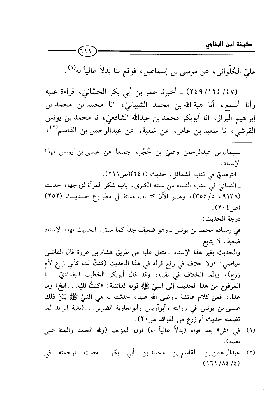 (47 / 124 / 249) - أَخْبَرَنَا عُمَرُ بْنُ أَبِي بَكْرٍ الْحَسَّانِيُّ، قِرَاءَةً عَلَيْهِ وَأَنَا أَسْمَعُ، أَنَا هِبَةُ اللَّهِ بْنُ مُحَمَّدٍ الشَّيْبَانِيُّ، أَنَا مُحَمَّدُ بْنُ مُحَمَّدِ بْنِ إِبْرَاهِيمَ الْبَزَّازُ، أَنَا أَبُو بَكْرٍ مُحَمَّدُ بْنُ عَبْدِ اللَّهِ الشَّافِعِيُّ، نَا مُحَمَّدُ بْنُ يُونُسَ الْقُرَشِيُّ، نَا سَعِيدُ بْنُ عَامِرٍ، عَنْ شُعْبَةَ، عَنْ عَبْدِ الرَّحْمَنِ بن الْقَاسِم،
