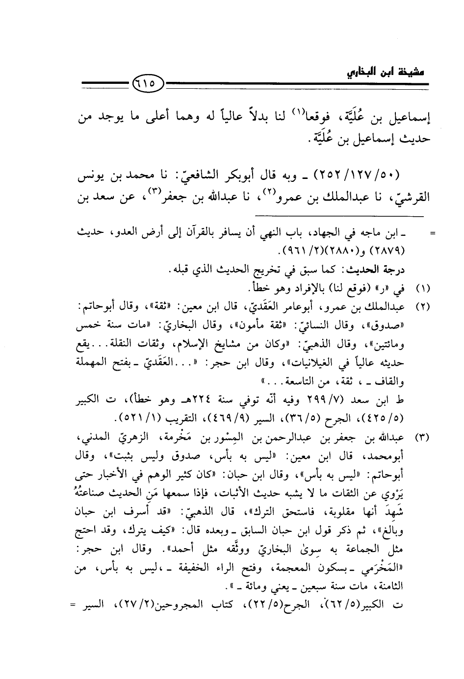 إِسْمَاعِيل بن عُلَيَّةَ، فَوَقَعَا لَنَا بَدَلًا عَالِيًا لَهُ وَهُمَا أَعلَى مَا يُوجد من حَدِيث إِسْمَاعِيل بن عُلَيَّةَ.