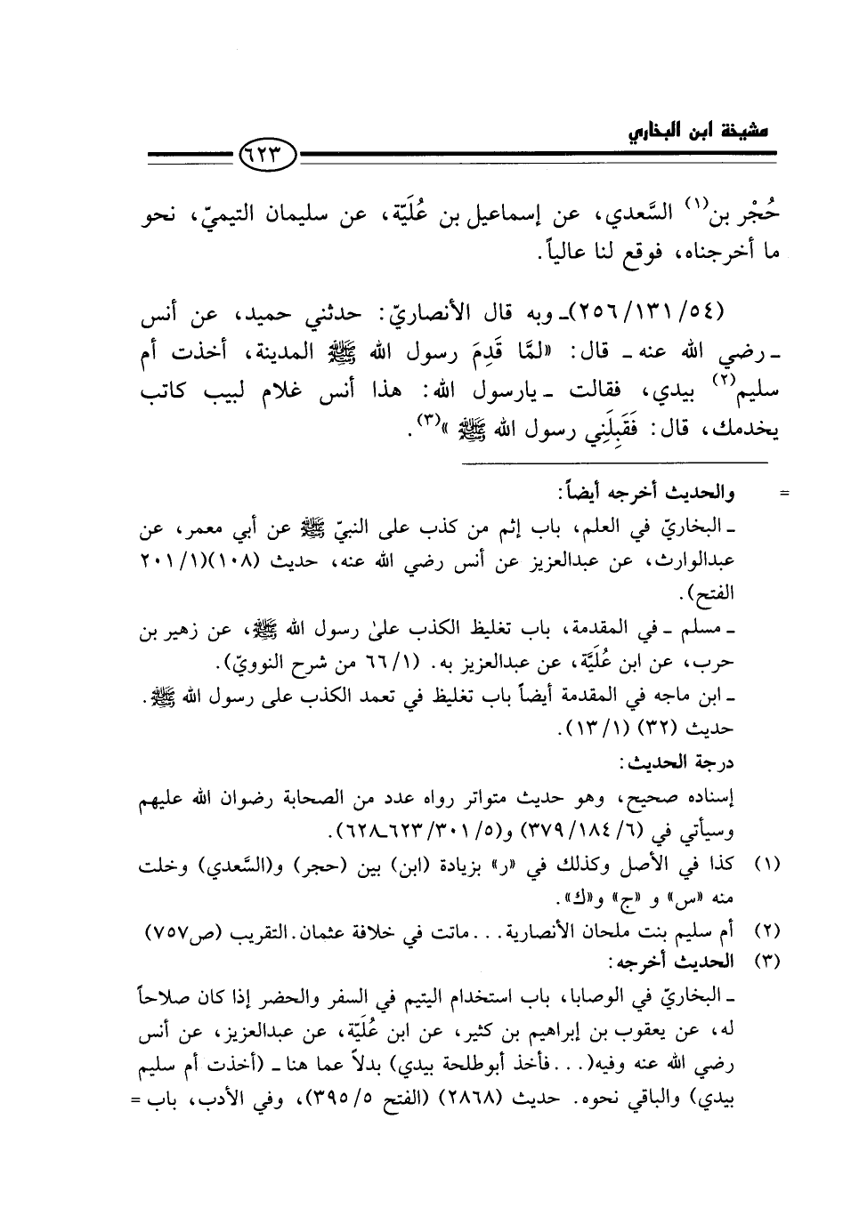 (54 / 131 / 256) - وَبِهِ قَالَ الْأَنْصَارِيُّ: حَدَّثَنِي حُمَيْدٍ، عَنْ أَنَسٍ - رَضِيَ اللَّهُ عَنْهُ - قَالَ: " لما قدم رَسُول الله - صَلَّى اللَّهُ عَلَيْهِ وَسَلَّم َ - الْمَدِينَةَ، أَخَذَتْ أُمُّ سُلَيْمٍ بِيَدِي، فَقَالَتْ - يَا رَسُولَ اللَّهِ: هَذَا أَنَسٌ غُلَامٌ لَبِيبٌ كَاتِبٌ يخدمك، قَالَ: فقبلني رَسُول الله - صَلَّى اللَّهُ عَلَيْهِ وَسَلَّم َ - ".
