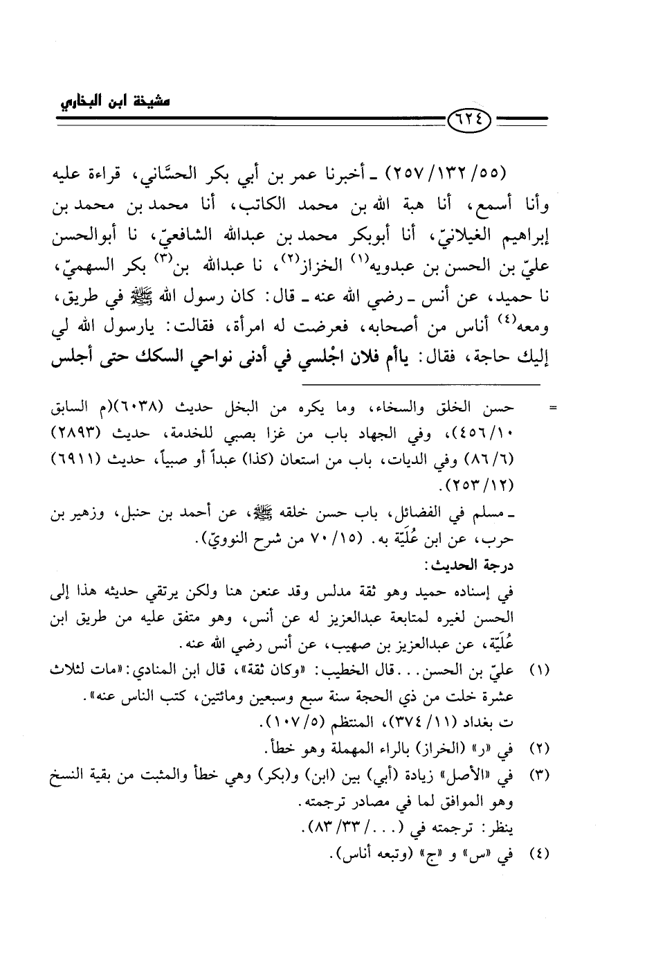 (55 / 132 / 257) - أَخْبَرَنَا عُمَرُ بْنُ أَبِي بَكْرٍ الْحَسَّانِيُّ، قِرَاءَةً عَلَيْهِ وَأَنَا أَسْمَعُ، أَنَا هِبَةُ اللَّهِ بْنُ مُحَمَّدٍ الْكَاتِبُ، أَنَا مُحَمَّدُ بْنُ مُحَمَّدِ بْنِ إِبْرَاهِيمَ الْغَيْلَانِيُّ، أَنَا أَبُو بَكْرٍ مُحَمَّدُ بْنُ عَبْدِ اللَّهِ الشَّافِعِيُّ، نَا أَبُو الْحَسَنِ عَلِيُّ بْنُ الْحَسَنِ بْنِ عَبْدَوَيْهِ الْخَزَّازُ، نَا عَبْدُ اللَّهِ بْنُ بَكْرٍ السَّهْمِيُّ، نَا حُمَيْدٌ، عَنْ أَنَسٍ - رَضِيَ اللَّهُ عَنْهُ - قَالَ: كَانَ رَسُولُ الله - صَلَّى اللَّهُ عَلَيْهِ وَسَلَّم َ - فِي طَرِيقٍ، وَمَعَهُ أُنَاسٌ مِنْ أَصْحَابِهِ، فَعَرَضَتْ لَهُ امْرَأَةٌ، فَقَالَتْ: يَا رَسُولَ اللَّهِ لِي إِلَيْكَ حَاجَةٌ، فَقَالَ: يَا أُمَّ فُلَانٍ اجْلِسِي فِي أَدْنَى نَوَاحِي السِّكَكِ حَتَّى أَجْلِسَ