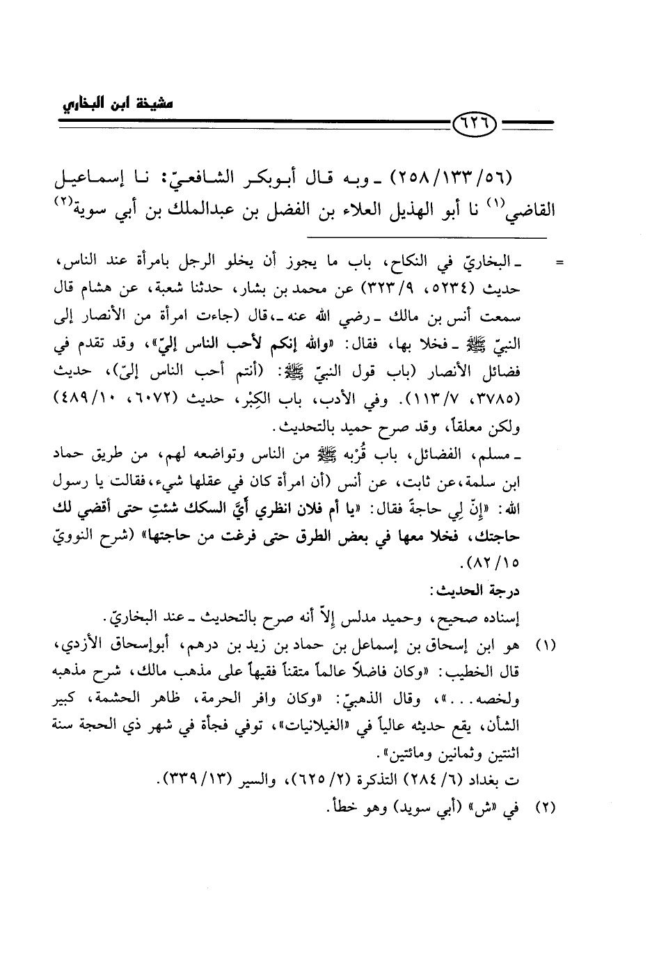 (56 / 133 / 258) - وَبِهِ قَالَ أَبُو بَكْرٍ الشَّافِعِيُّ: نَا إِسْمَاعِيلُ الْقَاضِي نَا أَبُو الْهُذَيْلِ الْعَلَاءُ بْنُ الْفَضْلِ بْنِ عَبْدِ الْمَلِكِ بْنِ أَبِي سَوِيَّةَ