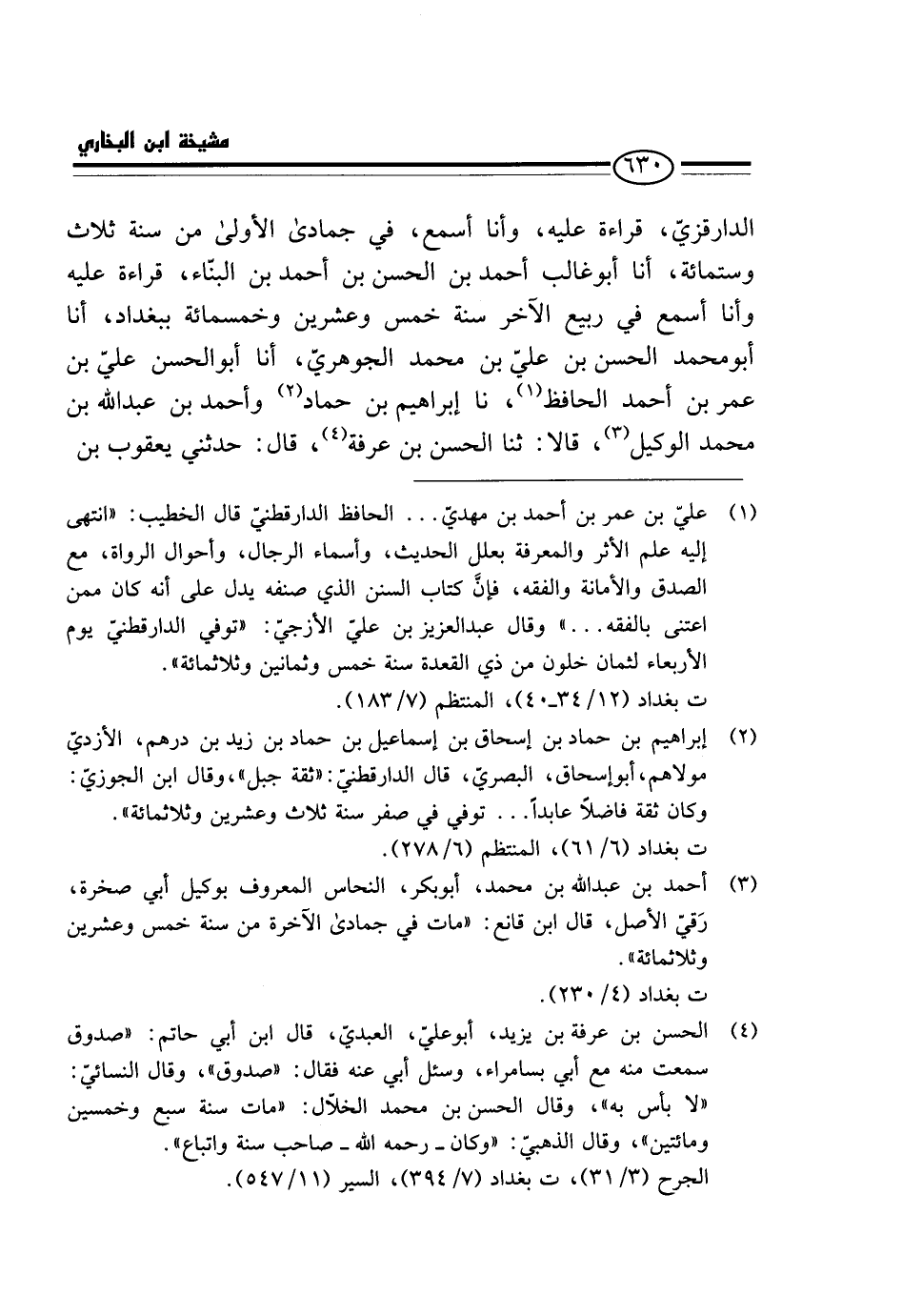 الدَّارَقَزِّيُّ، قِرَاءَةً عَلَيْهِ، وَأَنَا أَسْمَعُ، فِي جُمَادَى الأولى من سنة ثَلَاث وسِتمِائَة، أَنَا أَبُو غَالِبٍ أَحْمَدُ بْنُ الْحَسَنِ بْنِ أَحْمَدَ بْنِ الْبَنَّاءِ، قِرَاءَةً عَلَيْهِ وَأَنَا أَسْمَعُ فِي ربيع الآخر سنة خمس وَعشْرين وَخَمْسمِائة بِبَغْدَادَ، أَنَا أَبُو مُحَمَّدٍ الْحَسَنُ بْنُ عَلِيِّ بْنِ مُحَمَّدٍ الْجَوْهَرِيُّ، أَنَا أَبُو الْحَسَنِ عَلِيُّ بْنُ عُمَرَ بْنِ أَحْمَدَ الْحَافِظُ، نَا إِبْرَاهِيمُ بْنُ حَمَّادٍ وَأَحْمَدُ بْنُ عَبْدِ اللَّهِ بْنِ مُحَمَّدٍ الْوَكِيلُ، قَالا: ثَنَا الْحَسَنُ بْنُ عَرَفَةَ، قَالَ: حَدَّثَنِي يَعْقُوبُ بْنُ