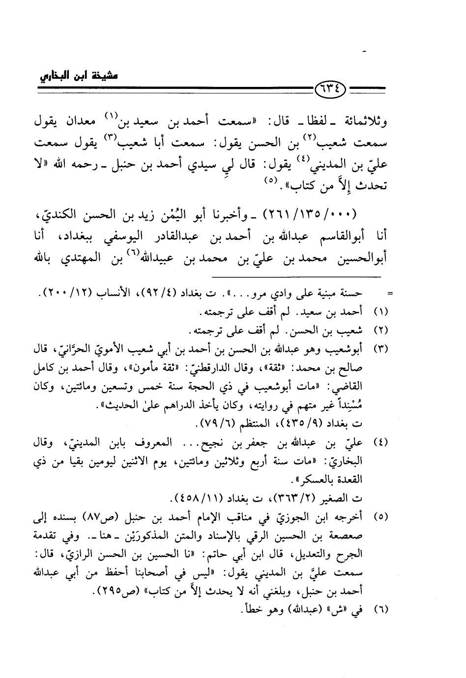 وثلاثمائة - لَفْظًا - قَالَ: " سَمِعْتُ أَحْمَدَ بْنَ سَعِيدِ ِبْنِ مَعْدَانَ يَقُولُ سَمِعْتُ شُعَيْبَ بْنَ الْحَسَنِ يَقُولُ: سَمِعْتُ أَبَا شُعَيْبٍ يَقُولُ سَمِعْتُ عَلِيَّ بْنَ الْمَدِينِيَّ يَقُولُ: قَالَ لِي سَيِّدِي أَحْمَدُ بْنُ حَنْبَلٍ - رَحِمَهُ اللَّهُ " لَا تُحَدِّثْ إِلَّا مِنْ كِتَابٍ ".