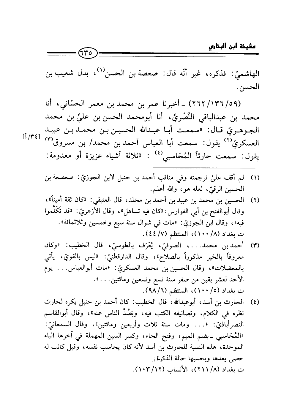 (59 / 136 / 262) - أَخْبَرَنَا عُمَرُ بْنُ مُحَمَّدِ بْنِ مَعْمَرٍ الْحَسَّانِيُّ، أَنَا مُحَمَّدُ بْنُ عَبْدِ الْبَاقِي النَّصْرِيُّ، أَنَا أَبُو مُحَمَّدٍ الْحَسَنُ بْنُ عَلِيِّ بْنِ مُحَمَّدٍ الْجَوْهَرِيُّ قَالَ: " سَمِعْتُ أَبَا عَبْدِ اللَّهِ الْحُسَيْنَ بْنَ مُحَمَّدِ بْنِ عُبَيْدٍ الْعَسْكَرِيَّ يَقُولُ: سَمِعْتُ أَبَا الْعَبَّاسِ أَحْمَدَ بْنَ مُحَمَّدِ / بْنِ مَسْرُوقٍ يَقُولُ: سَمِعْتُ حَارِثًا الْمُحَاسِبِيَّ: " ثَلَاثَةُ أَشْيَاءَ عَزِيزَةٌ أَوْ مَعْدُومَةٌ: