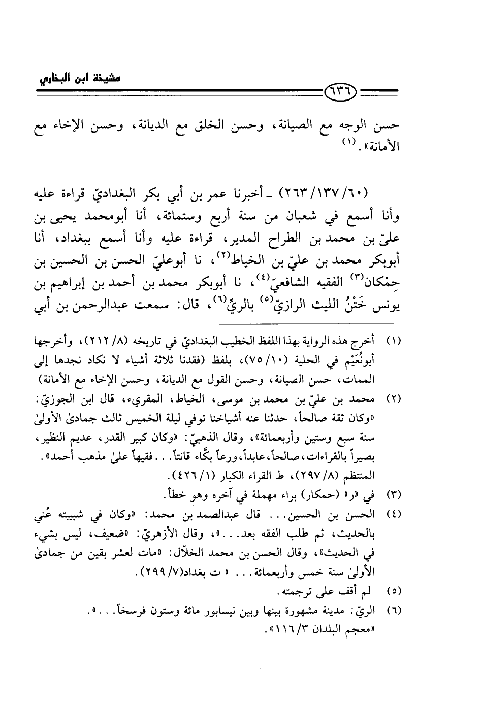 (60 / 137 / 263) - أَخْبَرَنَا عُمَرُ بْنُ أَبِي بَكْرٍ الْبَغْدَادِيُّ قِرَاءَةً عَلَيْهِ وَأَنَا اسْمَع فِي شعْبَان من سنة أَربع وسِتمِائَة، أَنَا أَبُو مُحَمَّدٍ يَحْيَى بْنُ عَلِيِّ بْنِ مُحَمَّدِ بْنِ الطَّرَّاح الْمُدِيرُ، قِرَاءَةً عَلَيْهِ وَأَنَا أَسْمَعُ بِبَغْدَادَ، أَنَا أَبُو بَكْرٍ مُحَمَّدُ بْنُ عَلِيِّ بْنِ الْخَيَّاطِ، نَا أَبُو عَلِيٍّ الْحَسَنُ بْنُ الْحُسَيْنِ بْنِ حِمْكَانَ الْفَقِيهُ الشَّافِعِيُّ، نَا أَبُو بَكْرٍ مُحَمَّدُ بْنُ أَحْمَدَ بْنِ إِبْرَاهِيمَ بْنِ يُونُسَ خَتَنُ اللَّيْثِ الرَّازِيُّ بِالرَّيِّ، قَالَ: سَمِعْتُ عَبْدَ الرَّحْمَنِ بْنَ أَبِي