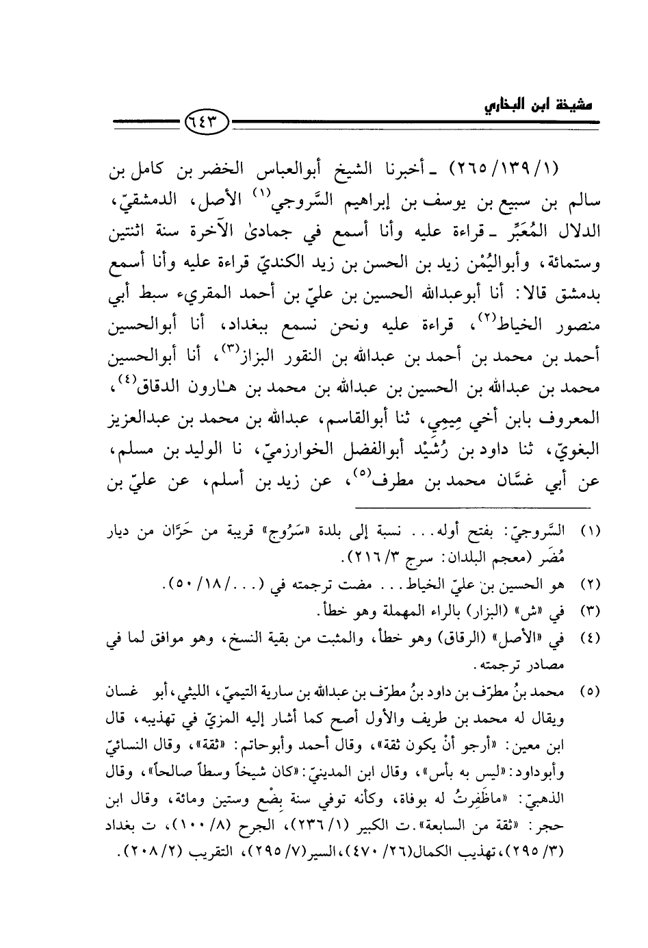 (1 / 139 / 265) - أَخْبَرَنَا الشَّيْخُ أَبُو الْعَبَّاسِ الْخَضِرُ بْنُ كَامِلِ بْنِ سَالِمِ بْنِ سُبَيْعِ بْنِ يُوسُفَ بْنِ إِبْرَاهِيمَ السَّرُوجِيُّ الْأَصْلِ، الدِّمَشْقِيُّ، الدَّلالُ الْمُعَبِّرُ - قِرَاءَةً عَلَيْهِ وَأَنَا أَسْمَعُ فِي جُمَادَى الْآخِرَةِ سَنَةَ اثْنَتَيْنِ وسِتمِائَة، وَأَبُو الْيُمْنِ زَيْدُ بْنُ الْحَسَنِ بْنِ زَيْدٍ الْكِنْدِيُّ قِرَاءَةً عَلَيْهِ وَأَنَا أَسْمَعُ بِدِمَشْقَ قَالا: أَنَا أَبُو عَبْدِ اللَّهِ الْحُسَيْنُ بْنُ عَلِيِّ بْنِ أَحْمَدَ الْمُقْرِئُ سِبْطُ أَبِي مَنْصُورٍ الْخَيَّاطِ، قِرَاءَةً عَلَيْهِ وَنَحْنُ نَسْمَعُ بِبَغْدَادَ، أَنَا أَبُو الْحُسَيْنِ أَحْمَدُ بْنُ مُحَمَّدِ بْنِ أَحْمَدَ بْنِ عَبْدِ اللَّهِ بْنِ النَّقُّورِ الْبَزَّازُ، أَنَا أَبُو الْحُسَيْنِ مُحَمَّدُ بْنُ عَبْدِ اللَّهِ بْنِ الْحُسَيْنِ بْنِ عَبْدِ اللَّهِ بْنِ مُحَمَّدِ بْنِ هَارُونَ الدَّقَّاقُ، الْمَعْرُوفُ بِابْنِ أَخِي مِيمِي، ثَنَا أَبُو الْقَاسِمِ، عَبْدُ اللَّهِ بْنُ مُحَمَّدِ بْنِ عَبْدِ الْعَزِيزِ الْبَغَوِيُّ، ثَنَا دَاوُدُ بْنُ رُشَيْدٍ أَبُو الْفَضْلِ الْخَوَارِزْمِيُّ، نَا الْوَلِيدُ بْنُ مُسْلِمٍ، عَنْ أَبِي غَسَّانَ مُحَمَّدِ بْنِ مُطَرِّفٍ، عَنْ زَيْدِ بْنِ أَسْلَمَ، عَنْ عَلِيِّ بْنِ