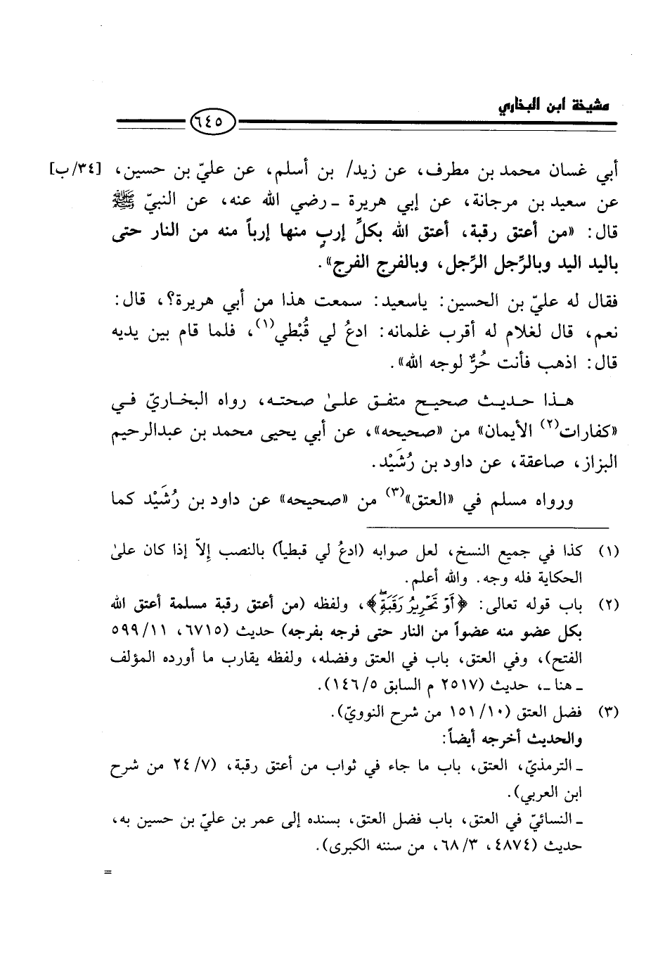 أَبِي غَسَّانَ مُحَمَّدِ بْنِ مُطَرِّفٍ، عَنْ زَيْدِ / بْنِ أَسْلَمَ، عَنْ عَلِيِّ بْنِ حُسَيْنٍ، عَنْ سَعِيدِ بْنِ مَرْجَانَةَ، عَنْ أَبِي هُرَيْرَةَ - رَضِيَ الله عَنهُ، عَن النَّبِي - صَلَّى اللَّهُ عَلَيْهِ وَسَلَّم َ - قَالَ: " مَنْ أَعْتَقَ رَقَبَةً، أَعْتَقَ اللَّهُ بِكُلِّ إرب مِنْهَا إرباً مِنَ النَّارِ حَتَّى بِالْيَدِ الْيَدَ وَبِالرِّجْلِ الرِّجْلَ، وَبِالْفَرْجِ الْفَرْجَ ". فَقَالَ لَهُ عَلِيُّ بْنُ الْحُسَيْنِ: يَا سَعِيدُ: سَمِعْتَ هَذَا مِنْ أَبِي هُرَيْرَةَ؟ قَالَ: نَعَمْ، قَالَ لِغُلَامٍ لَهُ أَقْرَبِ غِلْمَانِهِ: ادْع لي قبْطِي، فَلَمَّا قَامَ بَيْنَ يَدَيْهِ قَالَ: اذْهَبْ فَأَنْتَ حُرٌّ لِوَجْهِ اللَّهِ ".