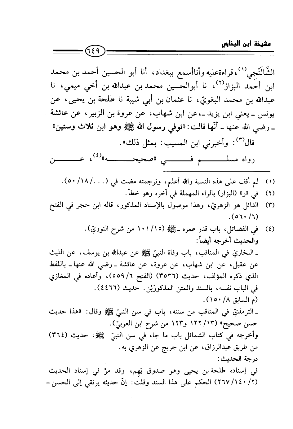 الشَّالَنْجِيُّ، قِرَاءَةً عَلَيْهِ وَأَنَا أَسْمَعُ بِبَغْدَادَ، أَنَا أَبُو الْحُسَيْن احْمَد بن مُحَمَّد ابْن أَحْمَدَ الْبَزَّازُ، نَا أَبُو الْحُسَيْنِ مُحَمَّدُ بْنُ عبد الله بن أَخِي مِيمِي، نَا عَبْدُ اللَّهِ بْنُ مُحَمَّدٍ الْبَغَوِيُّ، نَا عُثْمَانُ بْنُ أَبِي شَيْبَةَ نَا طَلْحَةُ بْنُ يَحْيَى، عَنْ يُونُسَ - يَعْنِي ابْنَ يَزِيدَ -، عَنِ ابْنِ شِهَابٍ، عَنْ عُرْوَةَ بْنِ الزُّبَيْرِ، عَنْ عَائِشَةَ - رَضِيَ اللَّه عَنْهَا - أَنَّهَا قَالَت: " توفّي رَسُول الله - صَلَّى اللَّهُ عَلَيْهِ وَسَلَّم َ - وَهُوَ ابْنُ ثَلَاثٍ وَسِتِّينَ ".