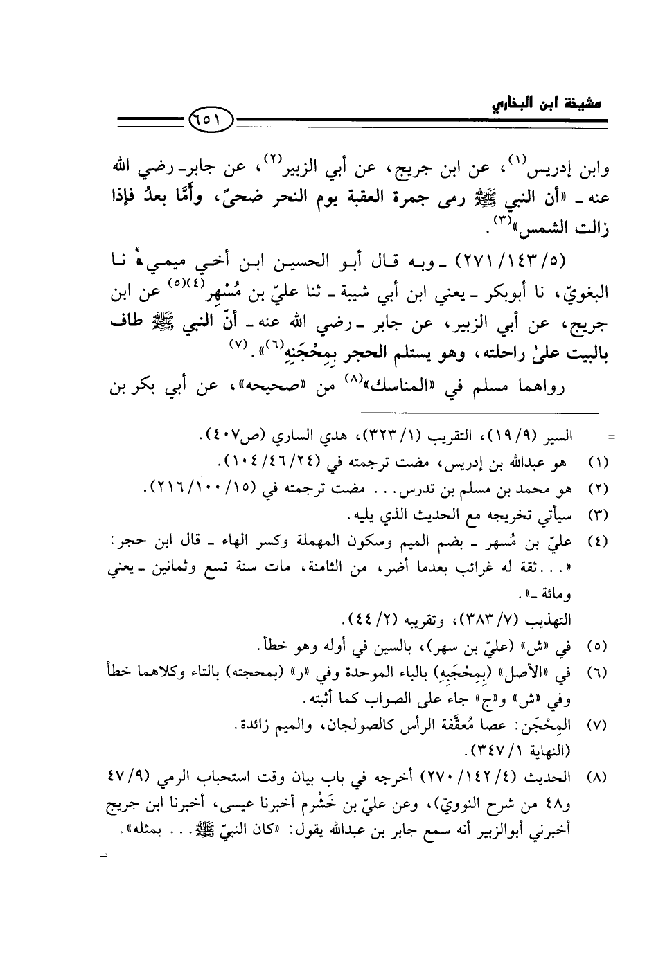 (5 / 143 / 271) - وَبِهِ قَالَ أَبُو الْحُسَيْنِ ابْنُ أَخِي مِيمِي: نَا الْبَغَوِيُّ، نَا أَبُو بَكْرٍ - يَعْنِي ابْنَ أَبِي شَيْبَةَ - ثَنَا عَلِيُّ بْنُ مُسْهِرٍ عَنِ ابْنِ جُرَيْجٍ، عَنْ أَبِي الزُّبَيْرِ، عَنْ جَابِرٍ - رَضِيَ اللَّهُ عَنْهُ - أَن النَّبِي - صَلَّى اللَّهُ عَلَيْهِ وَسَلَّم َ - طَافَ بِالْبَيْتِ عَلَى رَاحِلَتِهِ، وَهُوَ يَسْتَلِمُ الْحَجَرَ بِمِحْجَنِهِ ".