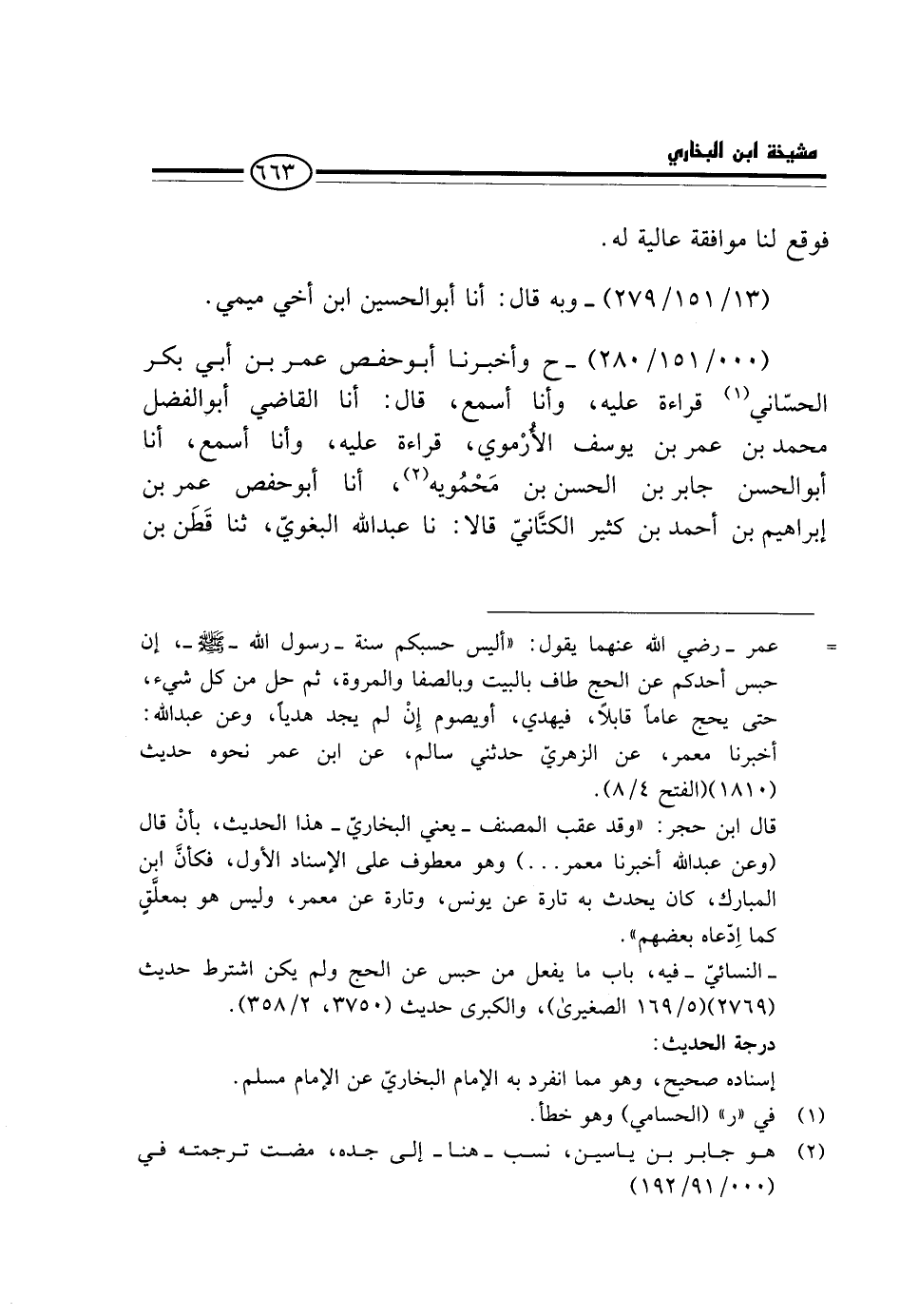 (000 / 151 / 280) - ح وَأَخْبَرَنَا أَبُو حَفْصٍ عُمَرُ بْنُ أَبِي بَكْرٍ الْحَسَّانِيُّ قِرَاءَةً عَلَيْهِ، وَأَنَا أَسْمَعُ، قَالَ: أَنَا الْقَاضِي أَبُو الْفَضْلِ مُحَمَّدُ بْنُ عُمَرَ بْنِ يُوسُفَ الْأُرْمَوِيُّ، قِرَاءَةً عَلَيْهِ، وَأَنَا أَسْمَعُ، أَنَا أَبُو الْحَسَنِ جَابِرُ بْنُ الْحَسَنِ بْنِ مَحْمَوَيْهِ، أَنَا أَبُو حَفْصٍ عُمَرُ بْنُ إِبْرَاهِيمَ بْنِ أَحْمَدَ بْنِ كَثِيرٍ الْكَتَّانِيُّ قَالا: نَا عَبْدُ اللَّهِ الْبَغَوِيُّ، ثَنَا قَطَنُ بْنُ