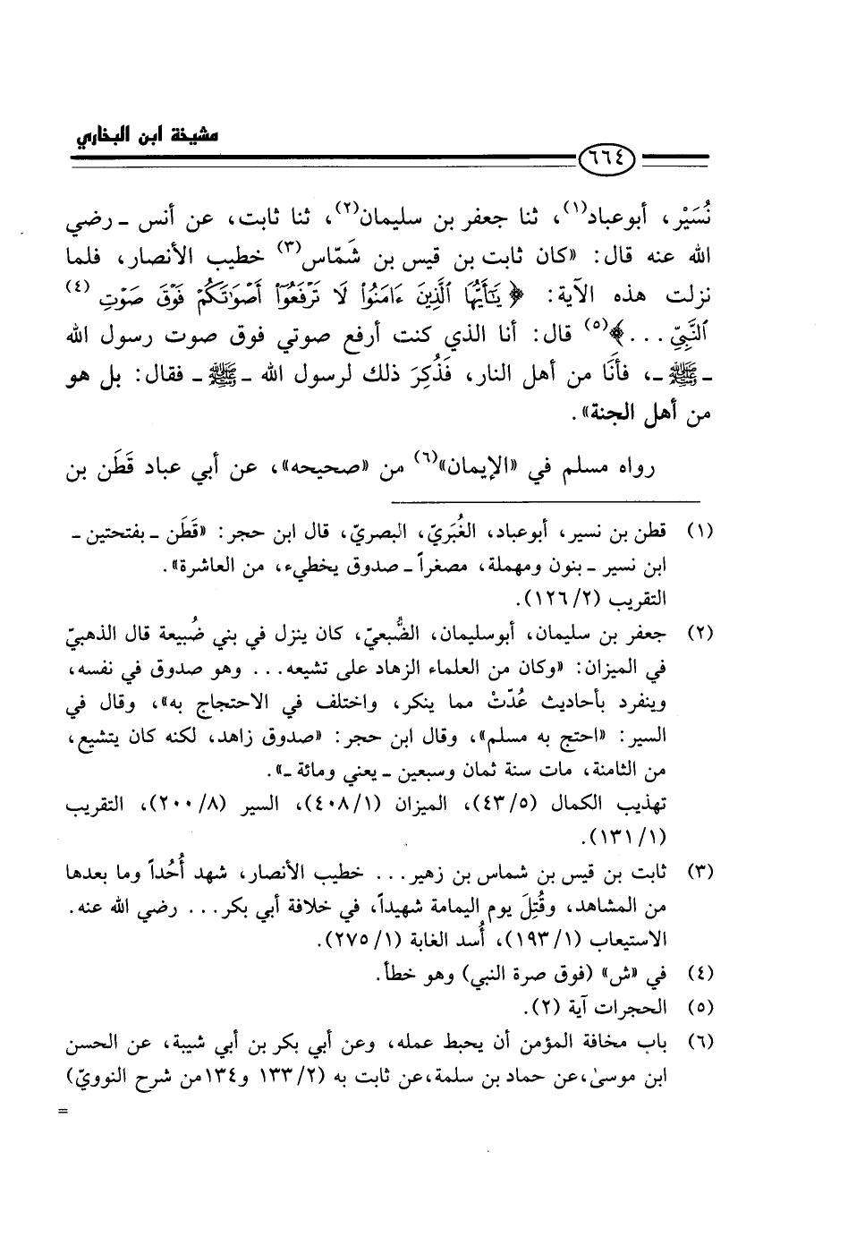نُسَيْرٍ، أَبُو عَبَّادٍ، ثَنَا جَعْفَرُ بْنُ سُلَيْمَانَ، ثَنَا ثَابِتٌ، عَنْ أَنَسٍ - رَضِيَ اللَّهُ عَنْهُ قَالَ: " كَانَ ثَابِتُ بْنُ قَيْسِ بْنِ شَمَّاسٍ خطيب الْأَنْصَار، فَلَمَّا نزلت هَذِه الْآيَة: {يَا أَيهَا الَّذِينَ آمَنُوا لَا تَرْفَعُوا أَصْوَاتَكُمْ فَوْقَ صَوْتِ النَّبِي} قَالَ: أَنَا الَّذِي كُنْتُ أَرْفَعُ صَوْتِي فَوْقَ صَوت رَسُول الله - صَلَّى اللَّهُ عَلَيْهِ وَسَلَّم َ -، فَأَنَا مِنْ أَهْلِ النَّارِ، فَذُكِرَ ذَلِكَ لِرَسُولِ الله - صَلَّى اللَّهُ عَلَيْهِ وَسَلَّم َ - فَقَالَ: بَلْ هُوَ مِنْ أَهْلِ الْجَنَّةِ ".