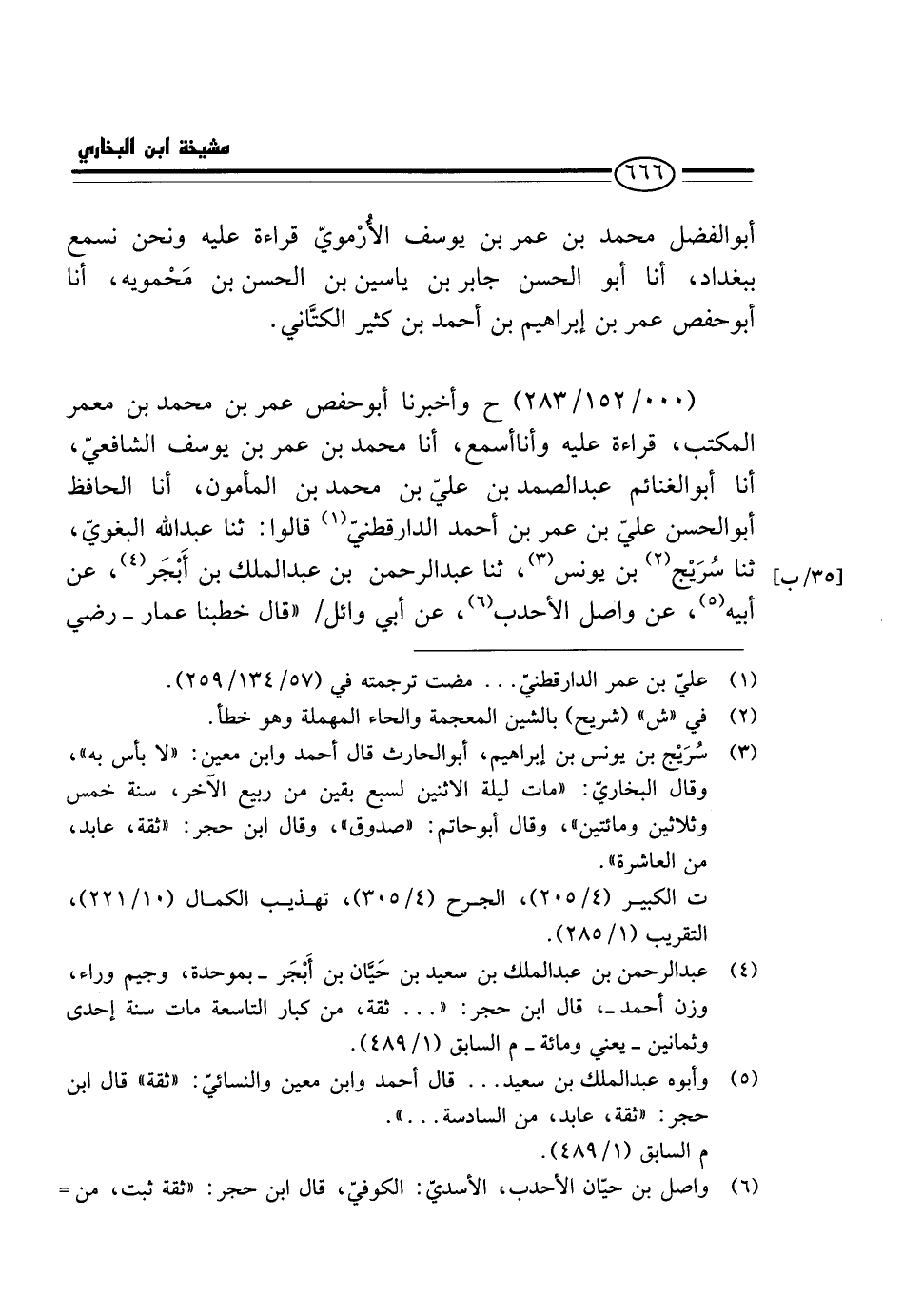 (000 / 152 / 283) - ح وَأَخْبَرَنَا أَبُو حَفْصٍ عُمَرُ بْنُ مُحَمَّدِ بْنِ مَعْمَرٍ الْمُكْتِبُ، قِرَاءَةً عَلَيْهِ وَأَنَا أَسْمَعُ، أَنَا مُحَمَّدُ بْنُ عُمَرَ بْنِ يُوسُفَ الشَّافِعِيُّ، أَنَا أَبُو الْغَنَائِمِ عَبْدُ الصَّمَدِ بْنُ عَلِيِّ بْنِ مُحَمَّدِ بْنِ الْمَأْمُونِ، أَنَا الْحَافِظُ أَبُو الْحَسَنِ عَلِيُّ بْنُ عُمَرَ بْنِ أَحْمَدَ الدَّارَقُطْنِيُّ قَالُوا: ثَنَا عَبْدُ اللَّهِ الْبَغَوِيُّ، ثَنَا سُرَيْجُ بْنُ يُونُسَ، ثَنَا عَبْدُ الرَّحْمَنِ بْنُ عَبْدِ الْمَلِكِ بْنِ أَبْجَرَ، عَنْ أَبِيهِ، عَنْ وَاصِلٍ الْأَحْدَبِ، عَنْ أَبِي وَائِلٍ / " قَالَ خَطَبَنَا عَمَّارٌ - رَضِيَ