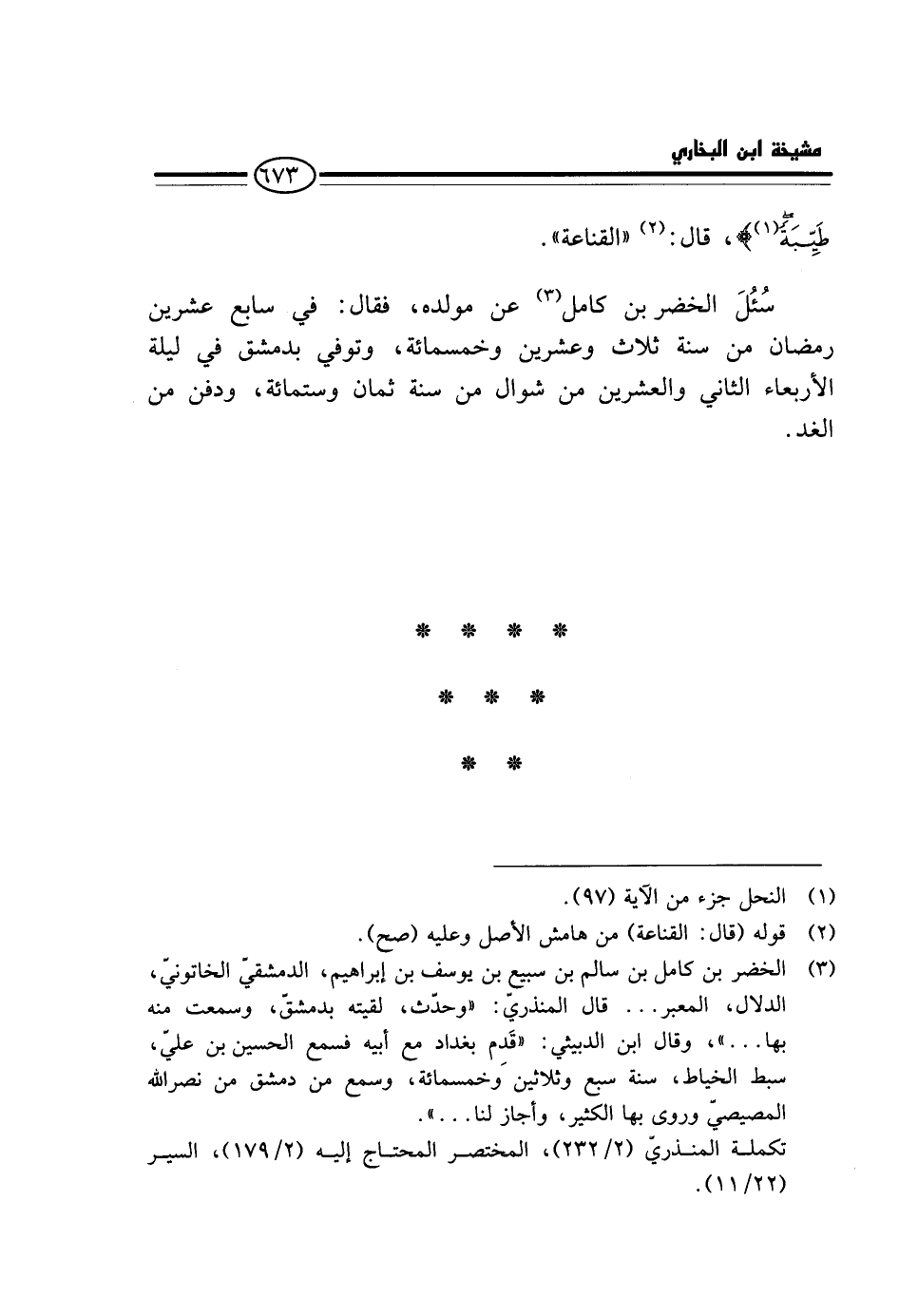 سُئِلَ الْخَضِرُ بْنُ كَامِلٍ عَنْ مَوْلِدِهِ، فَقَالَ: فِي سَابِعِ عِشْرِينَ رَمَضَانَ مِنْ سَنَةِ ثَلَاث وَعشْرين وَخَمْسمِائة، وَتُوُفِّيَ بِدِمَشْقَ فِي لَيْلَةِ الْأَرْبَعَاءِ الثَّانِي وَالْعِشْرِينَ من شَوَّال من سنة ثَمَان وسِتمِائَة، وَدفن من الْغَد.