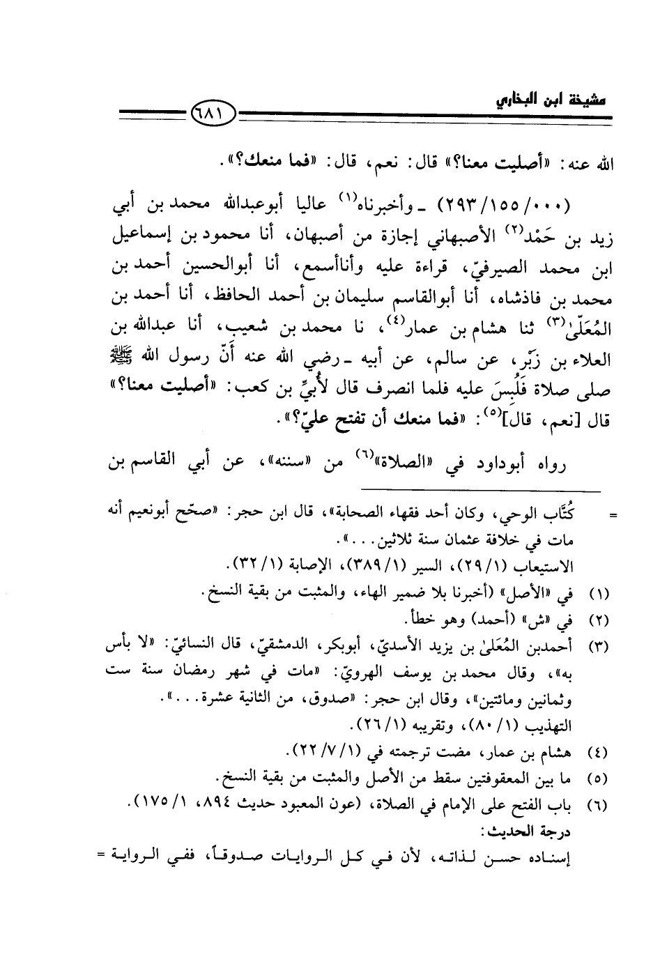 (000 / 155 / 293) - وَأَخْبَرَنَاهُ عَالِيًا أَبُو عَبْدِ اللَّهِ مُحَمَّدُ بْنُ أَبِي زَيْدِ بْنِ حَمَدٍ الْأَصْبَهَانِيُّ إِجَازَةً مِنْ أَصْبَهَانَ، أَنَا مَحْمُودُ بْنُ إِسْمَاعِيلَ ابْن مُحَمَّدٍ الصَّيْرَفِيُّ، قِرَاءَةً عَلَيْهِ وَأَنَا أَسْمَعُ، أَنَا أَبُو الْحُسَيْنِ أَحْمَدُ بْنُ مُحَمَّدِ بْنِ فَاذْشَاهْ، أَنَا أَبُو الْقَاسِمِ سُلَيْمَانُ بْنُ أَحْمَدَ الْحَافِظُ، أَنَا أَحْمَدُ بْنُ الْمُعَلَّى ثَنَا هِشَامُ بْنُ عَمَّارٍ، نَا مُحَمَّدُ بْنُ شُعَيْبٍ، أَنَا عَبْدُ اللَّهِ بْنُ الْعَلاءِ بْنِ زَبْرٍ، عَنْ سَالِمِ، عَنْ أَبِيهِ - رَضِيَ اللَّهُ عَنْهُ أَنَّ رَسُولَ الله - صَلَّى اللَّهُ عَلَيْهِ وَسَلَّم َ - صَلَّى صَلَاةً فَلُبِسَ عَلَيْهِ فَلَمَّا انْصَرَفَ قَالَ لِأُبَيِّ بْنِ كَعْبٍ: " أَصَلَّيْتَ مَعَنَا؟ " قَالَ [نَعَمْ، قَالَ] : " فَمَا مَنَعَكَ أَنْ تَفْتَح عَلَيَّ؟ ".
