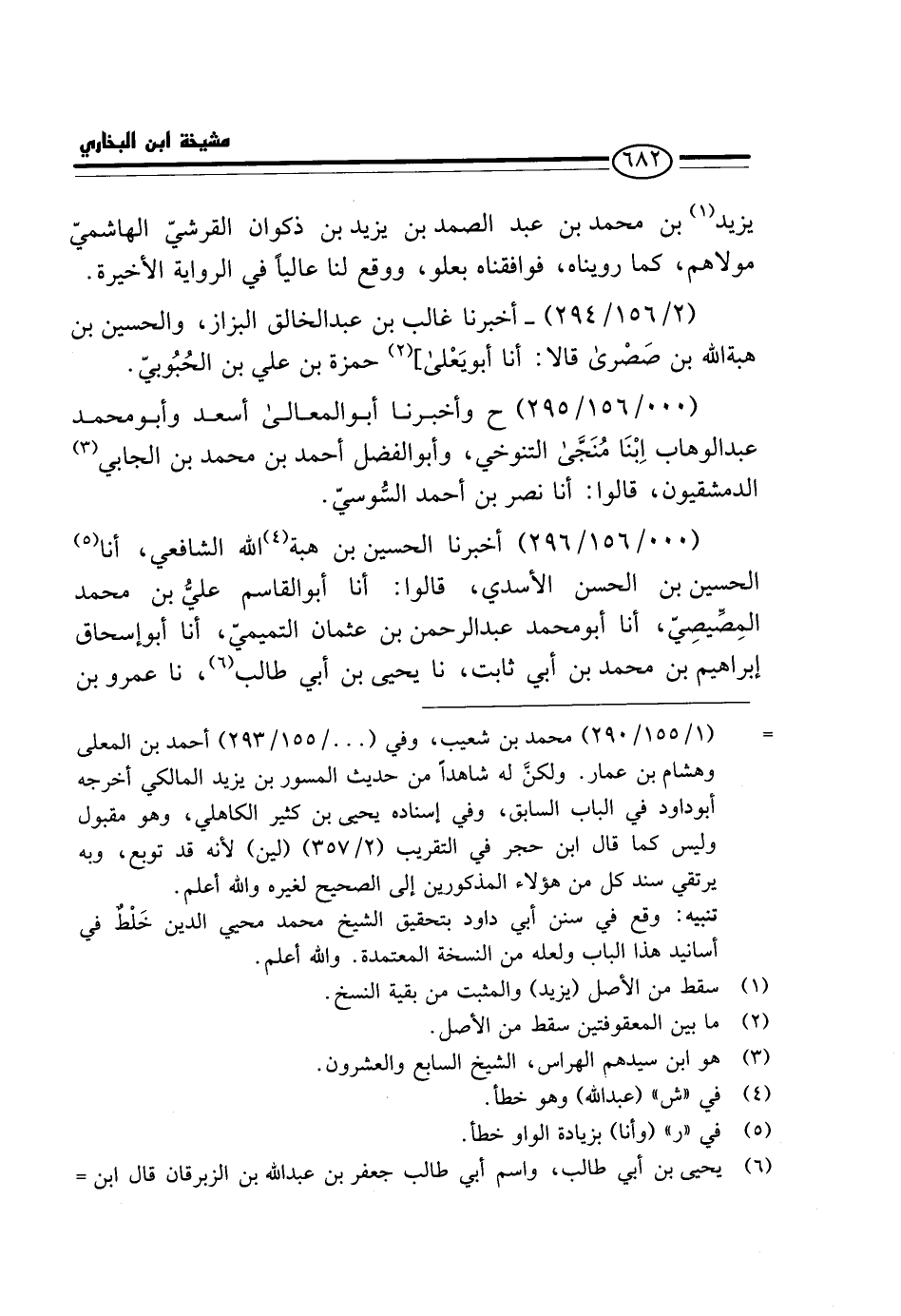 (000 / 156 / 296) - أَخْبَرَنَا الْحُسَيْنُ بْنُ هِبَةِ اللَّهِ الشَّافِعِيُّ، أَنَا الْحُسَيْنُ بْنُ الْحَسَنِ الْأَسَدِيُّ، قَالُوا: أَنَا أَبُو الْقَاسِمِ عَلِيُّ بْنُ مُحَمَّدٍ الْمِصِّيصِيُّ، أَنَا أَبُو مُحَمَّدٍ عَبْدُ الرَّحْمَنِ بْنُ عُثْمَانَ التَّمِيمِيُّ، أَنَا أَبُو إِسْحَاقَ إِبْرَاهِيمُ بْنُ مُحَمَّدِ بْنِ أَبِي ثَابِتٍ، نَا يَحْيَى بْنُ أَبِي طَالِبٍ، نَا عَمْرُو بْنُ