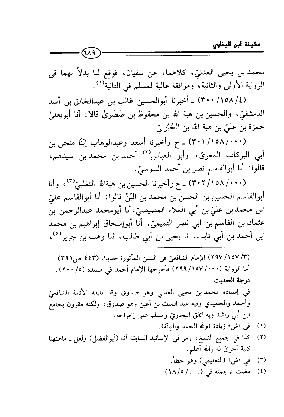 مُحَمَّدِ بْنِ يَحْيَى الْعَدَنِيِّ، كِلَاهُمَا، عَنْ سُفْيَانَ، فَوَقَعَ لَنَا بَدَلًا لَهُمَا فِي الرِّوَايَةِ الْأُولَى وَالثَّانِيَةِ، وَمُوَافَقَةً عَالِيَةً لِمُسْلِمٍ فِي الثَّانِيَةِ.