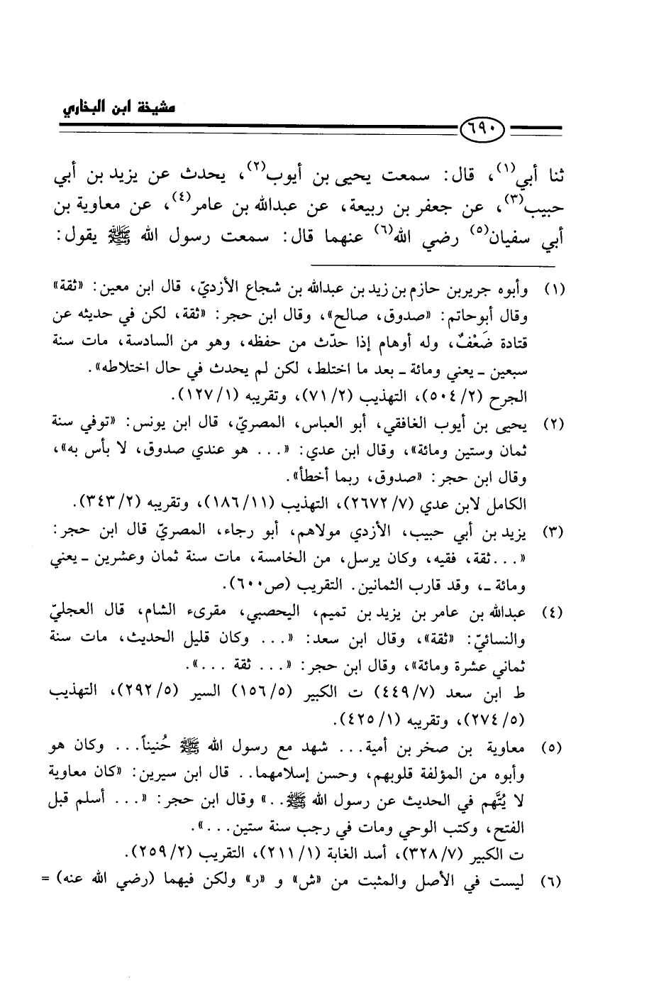 ثَنَا أَبِي، قَالَ: سَمِعْتُ يَحْيَى بْنَ أَيُّوبَ، يُحَدِّثُ عَنْ يَزِيدَ بْنِ أَبِي حَبِيبٍ، عَنْ جَعْفَرِ بْنِ رَبِيعَةَ، عَنْ عَبْدِ اللَّهِ بْنِ عَامِرٍ، عَنْ مُعَاوِيَةَ بْنِ أَبِي سُفْيَانَ رَضِيَ الله عَنْهُمَا قَالَ: سَمِعت رَسُول الله - صَلَّى اللَّهُ عَلَيْهِ وَسَلَّم َ - يَقُول: