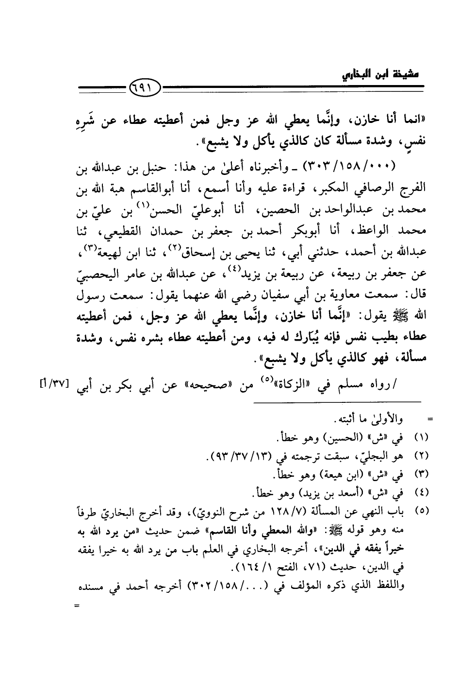 (000 / 158 / 303) - وَأَخْبَرَنَاهُ أَعْلَى مِنْ هَذَا: حَنْبَلُ بْنُ عَبْدِ اللَّهِ بْنِ الْفَرَجِ الرُّصَافِيُّ الْمُكَبِّرُ، قِرَاءَةً عَلَيْهِ وَأَنَا أَسْمَعُ، أَنَا أَبُو الْقَاسِمِ هِبَةُ اللَّهِ بْنُ مُحَمَّدِ بْنِ عَبْدِ الْوَاحِدِ بْنِ الْحُصَيْنِ، أَنَا أَبُو عَلِيٍّ الْحَسَنُ بْنُ عَلِيِّ بْنِ مُحَمَّدٍ الْوَاعِظُ، أَنَا أَبُو بَكْرٍ أَحْمَدُ بْنُ جَعْفَرِ بْنِ حَمْدَانَ الْقَطِيعِيُّ، ثَنَا عَبْدُ اللَّهِ بْنُ أَحْمَدَ، حَدَّثَنِي أَبِي، ثَنَا يَحْيَى بْنُ إِسْحَاقَ، ثَنَا ابْنُ لَهِيعَةَ، عَنْ جَعْفَرِ بْنِ رَبِيعَةَ، عَنْ رَبِيعَةَ بْنِ يَزِيدَ، عَنْ عَبْدِ اللَّهِ بْنِ عَامِرٍ الْيَحْصُبِيِّ قَالَ: سَمِعْتُ مُعَاوِيَةَ بْنَ أَبِي سُفْيَانَ رَضِيَ اللَّهُ عَنْهُمَا يَقُولُ: سَمِعت رَسُول الله - صَلَّى اللَّهُ عَلَيْهِ وَسَلَّم َ - يَقُولُ: " إِنَّمَا أَنَا خَازِنٌ، وَإِنَّمَا يُعْطِي اللَّهُ عَزَّ وَجَلَّ، فَمَنْ أَعْطَيْتُهُ عَطَاءً بِطِيبِ نَفْسٍ فَإِنَّهُ يُبَارَكُ لَهُ فِيهِ، وَمَنْ أَعْطَيْتُهُ عَطَاءً بِشَرَهِ نَفْسٍ، وَشِدَّةِ مَسْأَلَةٍ، فَهُوَ كَالَّذِي يَأْكُلُ وَلَا يَشْبَعُ ".