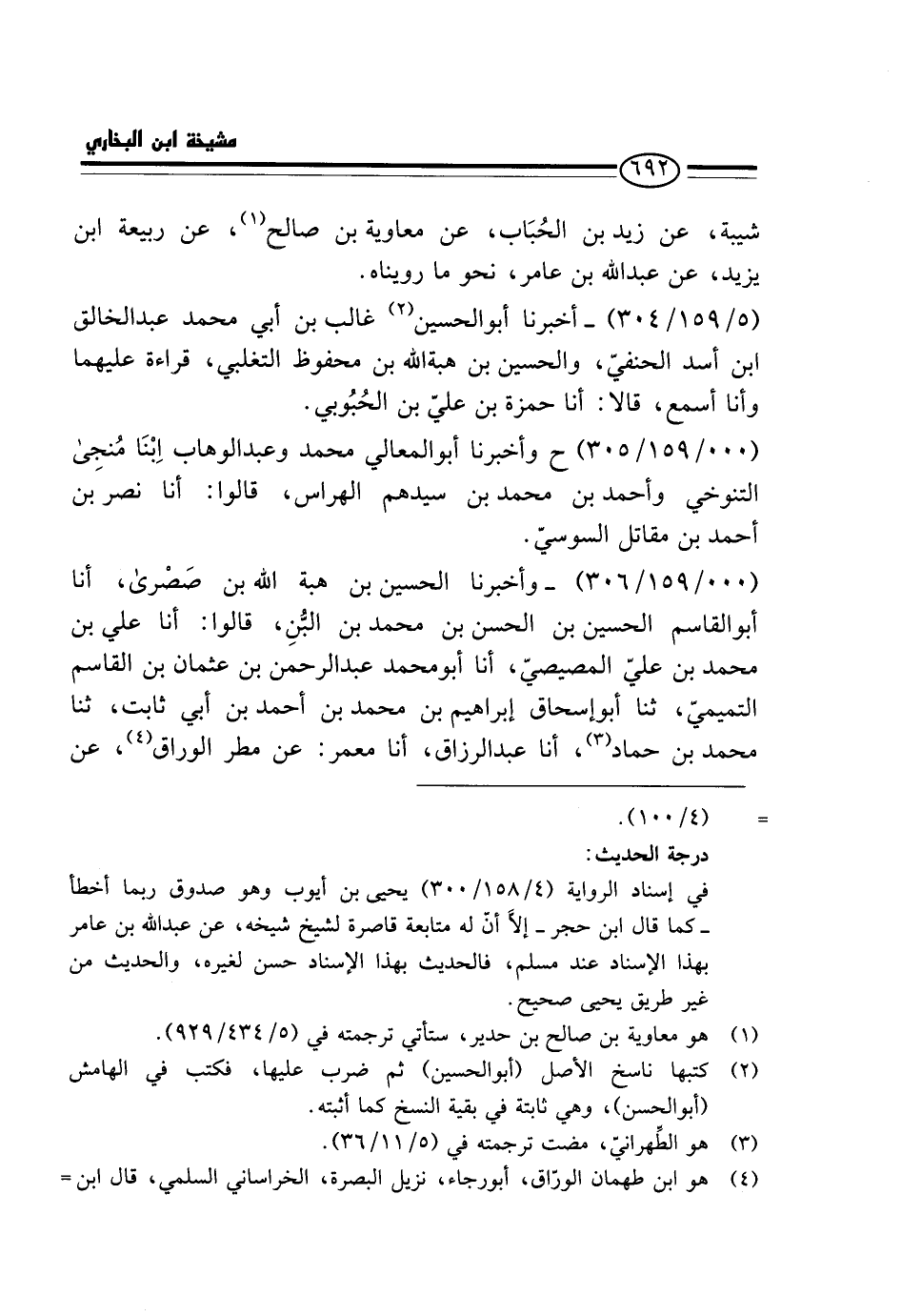 (000 / 159 / 305) - ح وَأَخْبَرَنَا أَبُو الْمَعَالِي مُحَمَّدٌ وَعَبْدُ الْوَهَّابِ ابْنَا مُنَجَّى التَّنُوخِيُّ وَأَحْمَدُ بْنُ مُحَمَّدِ بْنِ سيدهم الْهَرَّاسُ، قَالُوا: أَنَا نَصْرُ بْنُ أَحْمَدَ بْنِ مُقَاتِلٍ السُّوسِيُّ.