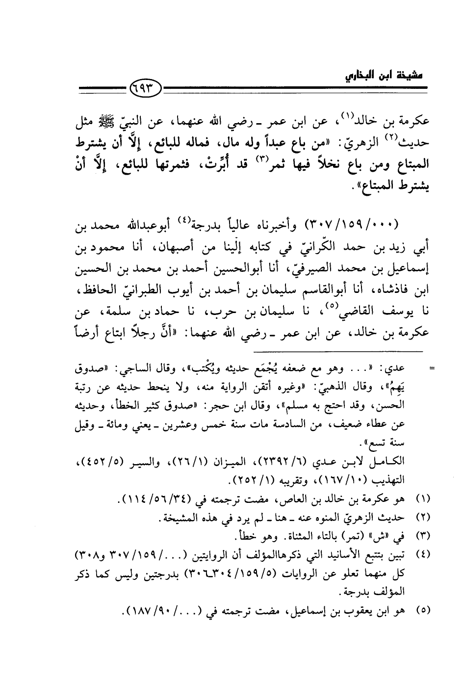 (000 / 159 / 307) - وَأَخْبَرَنَاهُ عَالِيًا بِدَرَجَةٍ أَبُو عَبْدِ اللَّهِ مُحَمَّدُ بْنُ أَبِي زَيْدِ بْنِ حَمَدٍ الْكَرَّانِيُّ فِي كِتَابِهِ إِلَيْنَا مِنْ أَصْبَهَانَ، أَنَا مَحْمُودُ بْنُ إِسْمَاعِيلَ بْنِ مُحَمَّدٍ الصَّيْرَفِيُّ، أَنَا أَبُو الْحُسَيْنِ أَحْمَدُ بن مُحَمَّد بن الْحُسَيْن ابْن فَاذْشَاهْ، أَنَا أَبُو الْقَاسِمِ سُلَيْمَانُ بْنُ أَحْمَدَ بن أَيُّوب الطَّبَرَانِيّ الْحَافِظُ، نَا يُوسُفُ الْقَاضِي، نَا سُلَيْمَانُ بْنُ حَرْبٍ، نَا حَمَّادُ بْنُ سَلَمَةَ، عَنْ عِكْرِمَةَ بْنِ خَالِدٍ، عَنِ ابْنِ عُمَرَ - رَضِيَ اللَّهُ عَنْهُمَا: " أَنَّ رَجُلًا ابْتَاعَ أَرْضًا